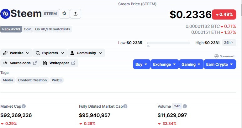 The live Steem price today is $0,234465 USD with a 24-hour trading volume of $11 629 097 USD. We update our STEEM to USD price in real-time. Steem is down 0,29% in the last 24 hours. The current CoinMarketCap ranking is #249, with a live market cap of $92 602 344 USD. It has a circulating supply of 394 951 699 STEEM coins and the max. supply is not available.