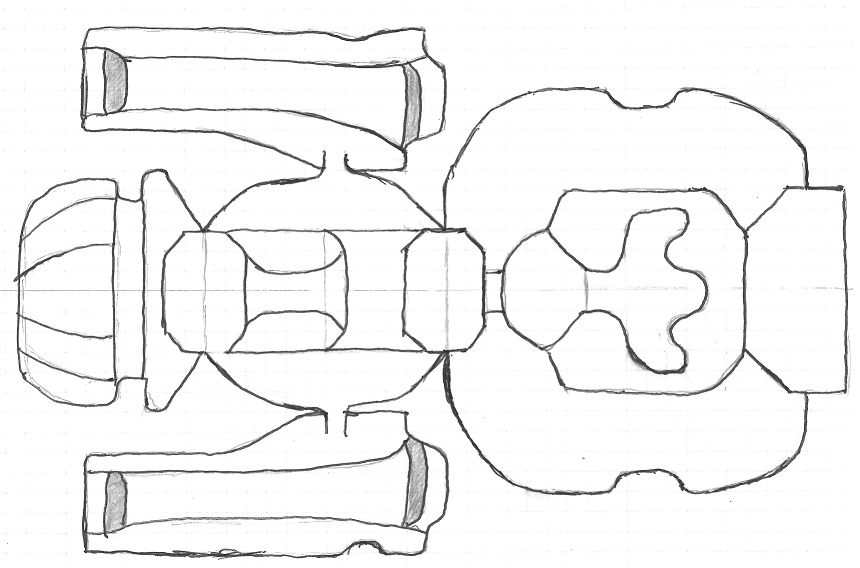 With a measure of my capacities to draw, it will be less of an issue to determine the limits on the scope. What I mean is that in my mind, the player will control a ship that has weapons mounted on the top, some slots for power (to force decisions; do I want that 1 super gun or 2-3 smaller guns for ex), slots for the weapons that will rotate to target, a radar that will extend the fog of war, and a launch bay for small fighter ships and/or mining ships to gather resources from asteroids for example.