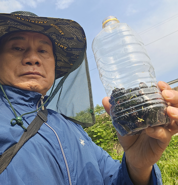 뽕나무 아래 가서 조심스럼 게 오디를 따서 담았다.