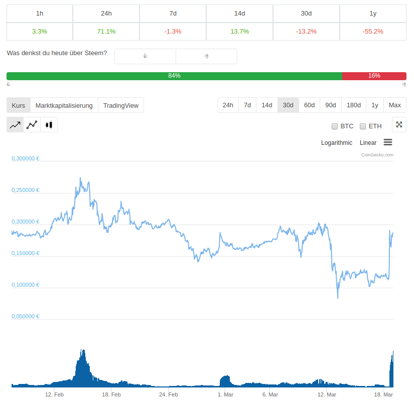As of writing this, the price of Steem did another huge jump: over 71% up in one day (this time I'm using data from @coingecko) !!! Given the current market situation, this is astounding. The upcoming hardfork and the prospect of two separate chains inflates the price.