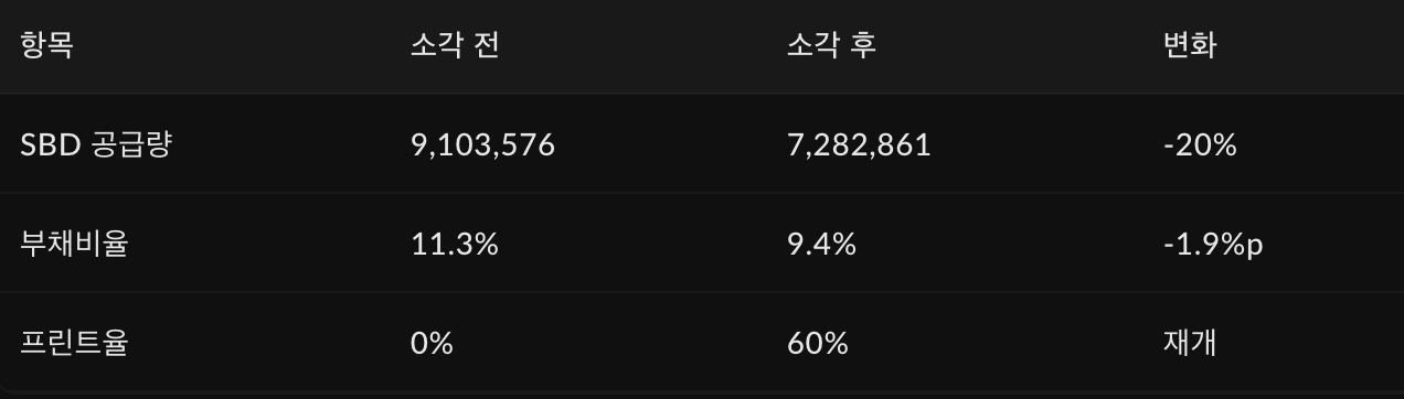 현재 유통량(9,103,576 SBD)의 20%를 소각한다고 가정하면 부채비율이 11.3%에서 9.4%(10%이하)로 하락하게 되며, 이에 따라 SBD의 발행이 재개가 됩니다. (아래 표 참조)