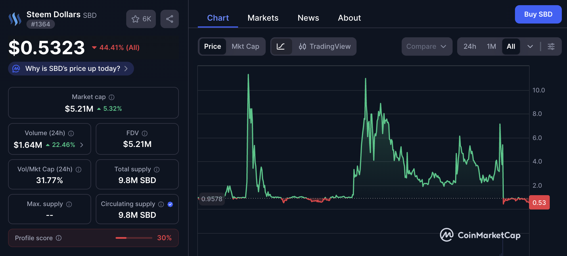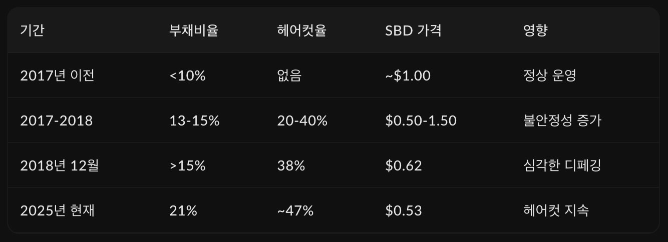 현재 SBD의 가격은 약 $0.53 정도에서 거래가 되고 있는데, 이 가격은 우리가 기대하는 $1에 한참 못 미치는 가격이지만 사실 현재 스팀의 부채비율과 헤어컷 메커니즘 상태를 기준으로 했을 때는 오히려 적정가치보다 높은 가격이긴 합니다.
