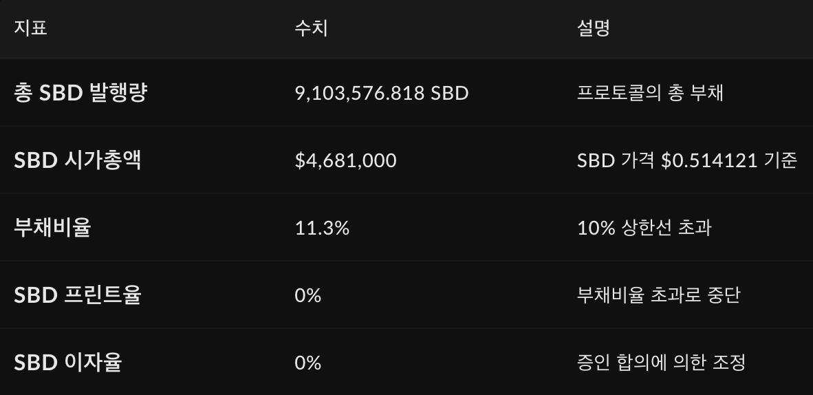 기본적으로 스팀달러(SBD)는 Steem 프로토콜의 리워드 풀을 통해서만 발행되는 안정성 메커니즘을 내재하고 있는 유사 스테이블코인이자 프로토콜의 부채입니다. 그리고 Steem 프로토콜은 자체적으로 부채비율을 10% 선에서 관리하게끔 설정되어 있습니다.