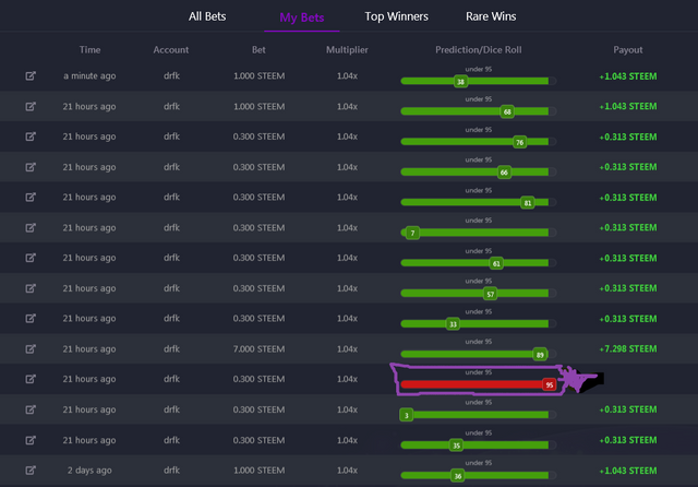 to start this trick at least we need 7 steem, Our trick to increase our chances of winning is as follows We adjust the bar to 95 to have a 94% chance of winning and play, in the case of losing our bet we raise it to recover the lost and then go down to the initial amount to continue playing Eg play with 0.3 steem in the case of losing we increase our bet to 7 to recover these 0,3 steem after winning we continue playing. as it appears in the image