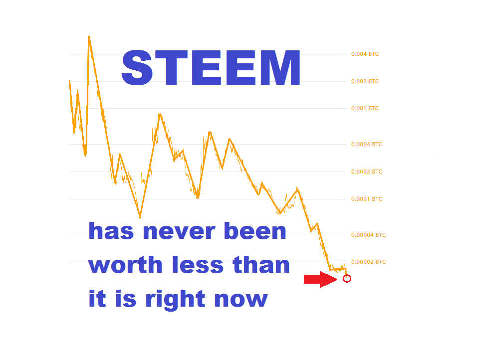 In the past couple hours, STEEM's value against Bitcoin (in other words, it's purchasing power) plunged to a new all-time low.