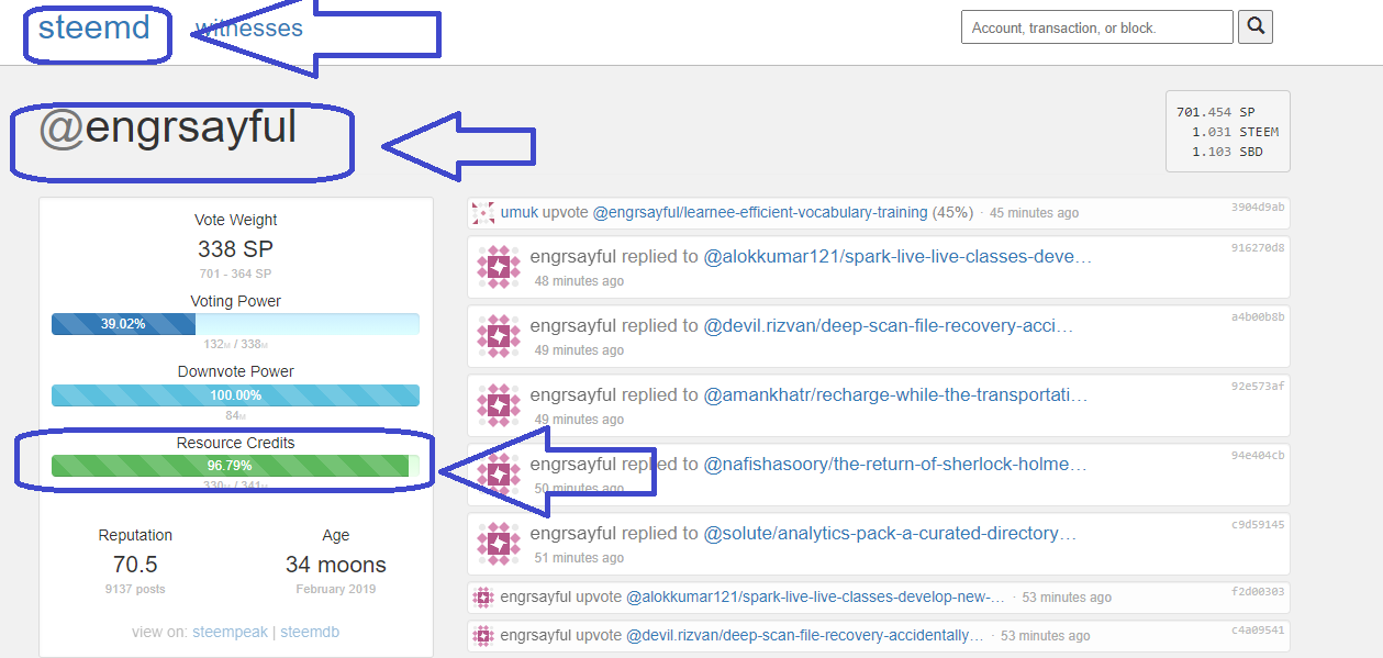 এই হিসাবটি খুব সহজ। আপনি আপনার রিসোর্স ক্রেডিট অনেক জায়গায় চেক করতে পারেন। আমি https://steemd.com/ থেকে দেখাচ্ছি। এখানে আপনার ইউজারনেম দিলে নিচের ইন্টারফেস আসবে।