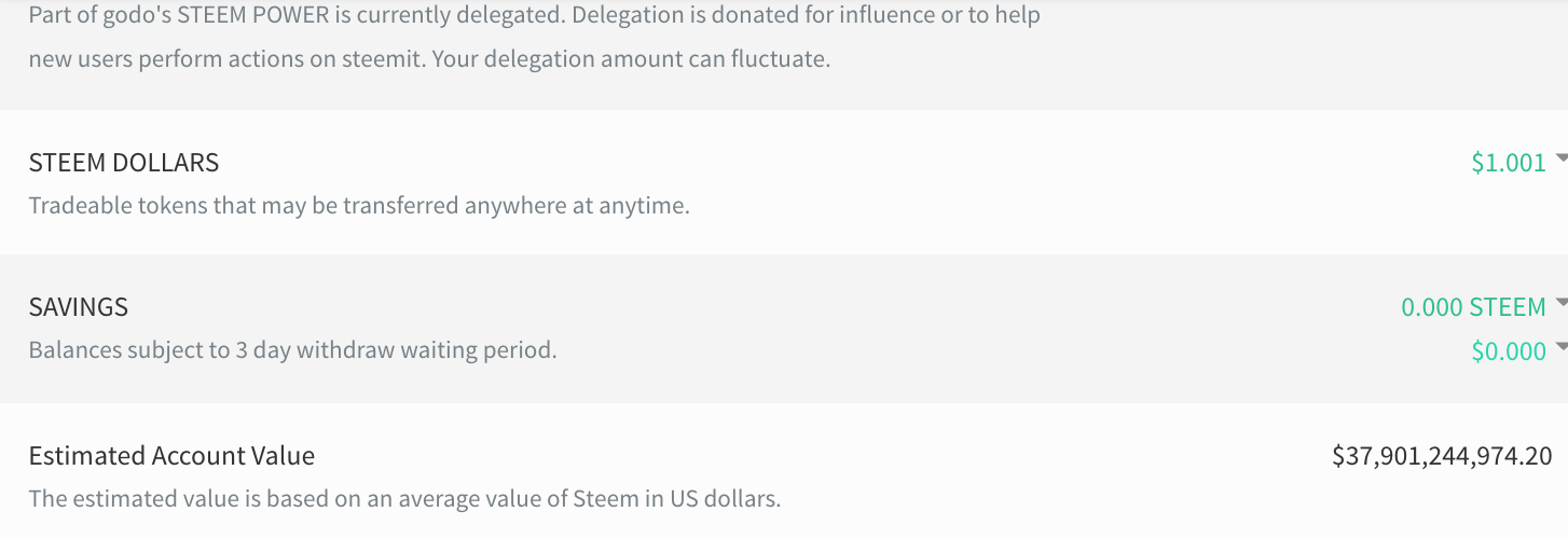 New investment?godo (49)in #steem • 7 years ago (edited) I came here to buy some cheap steem but my estimated account value has me puzzled? What's going on? #trillion #funny #what #faq