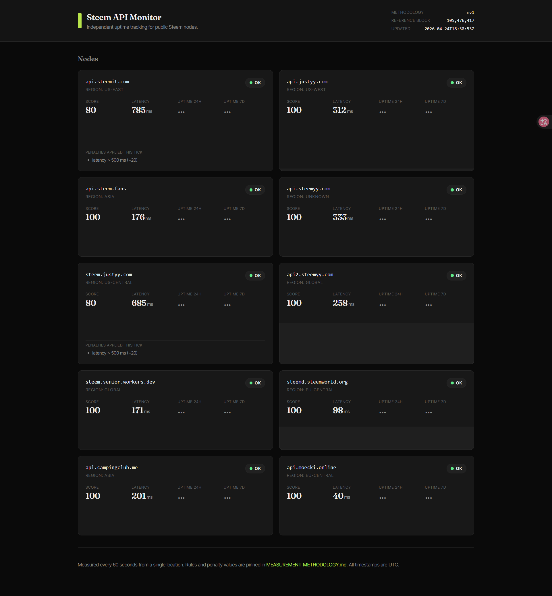 You'll see status, health score, latency, uptime (24h/7d) and a 60-minute sparkline for each node. The 10 currently monitored nodes include api.steemit.com, api.justyy.com, steemd.steemworld.org, api.moecki.online, api.campingclub.me and others.