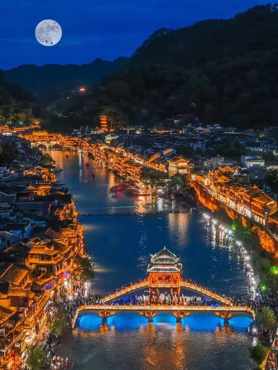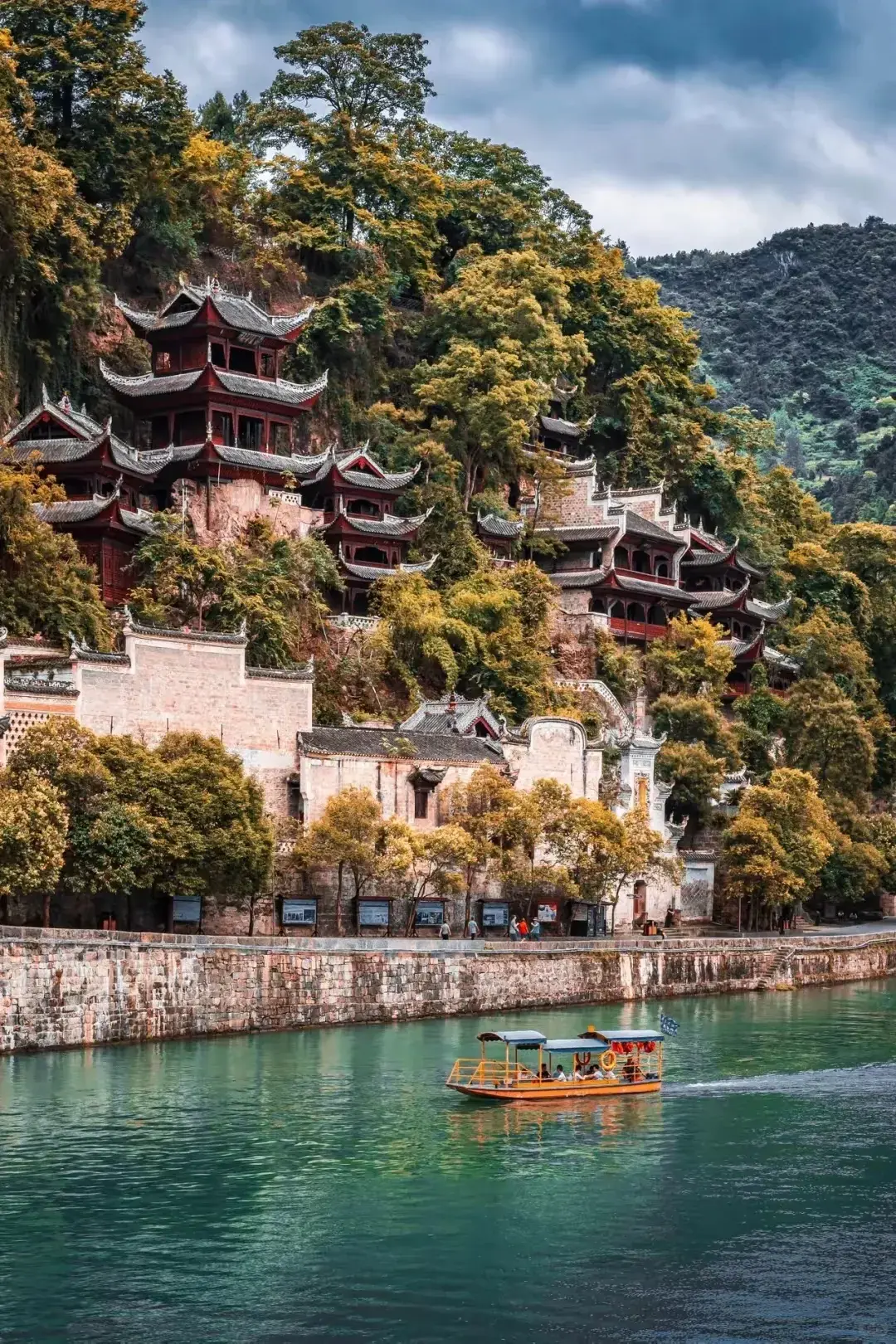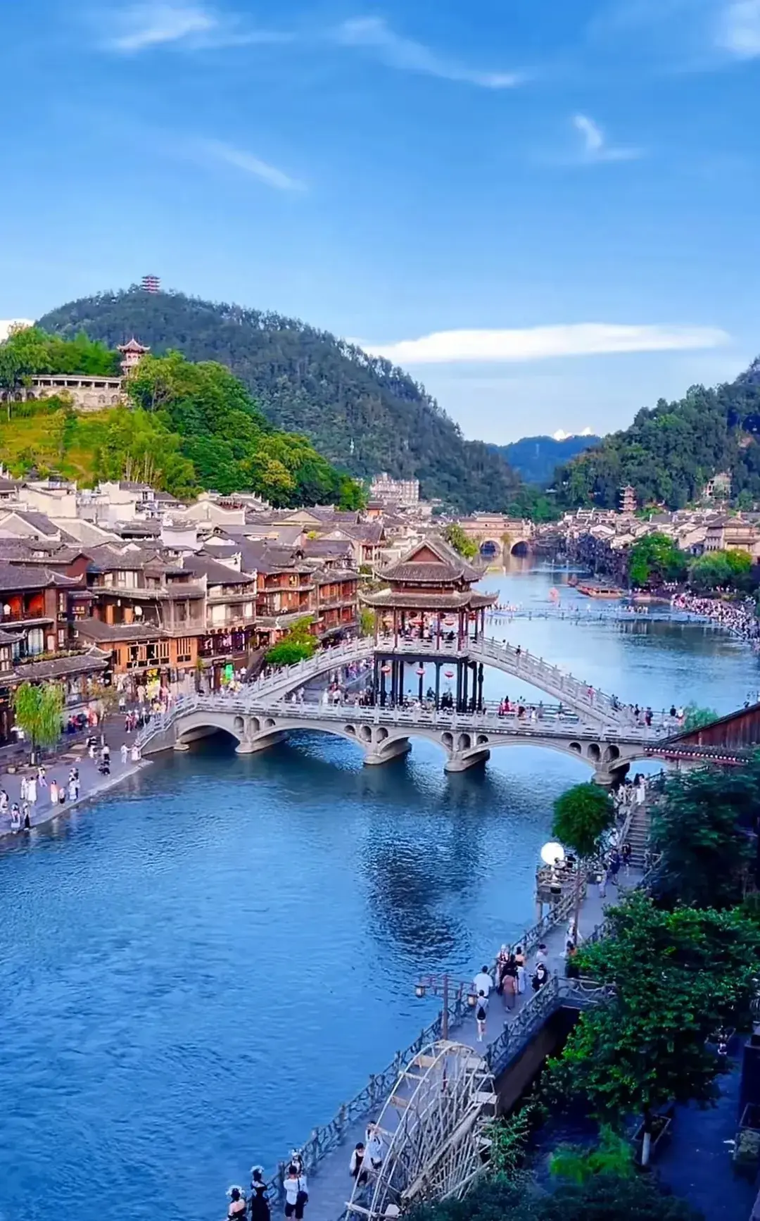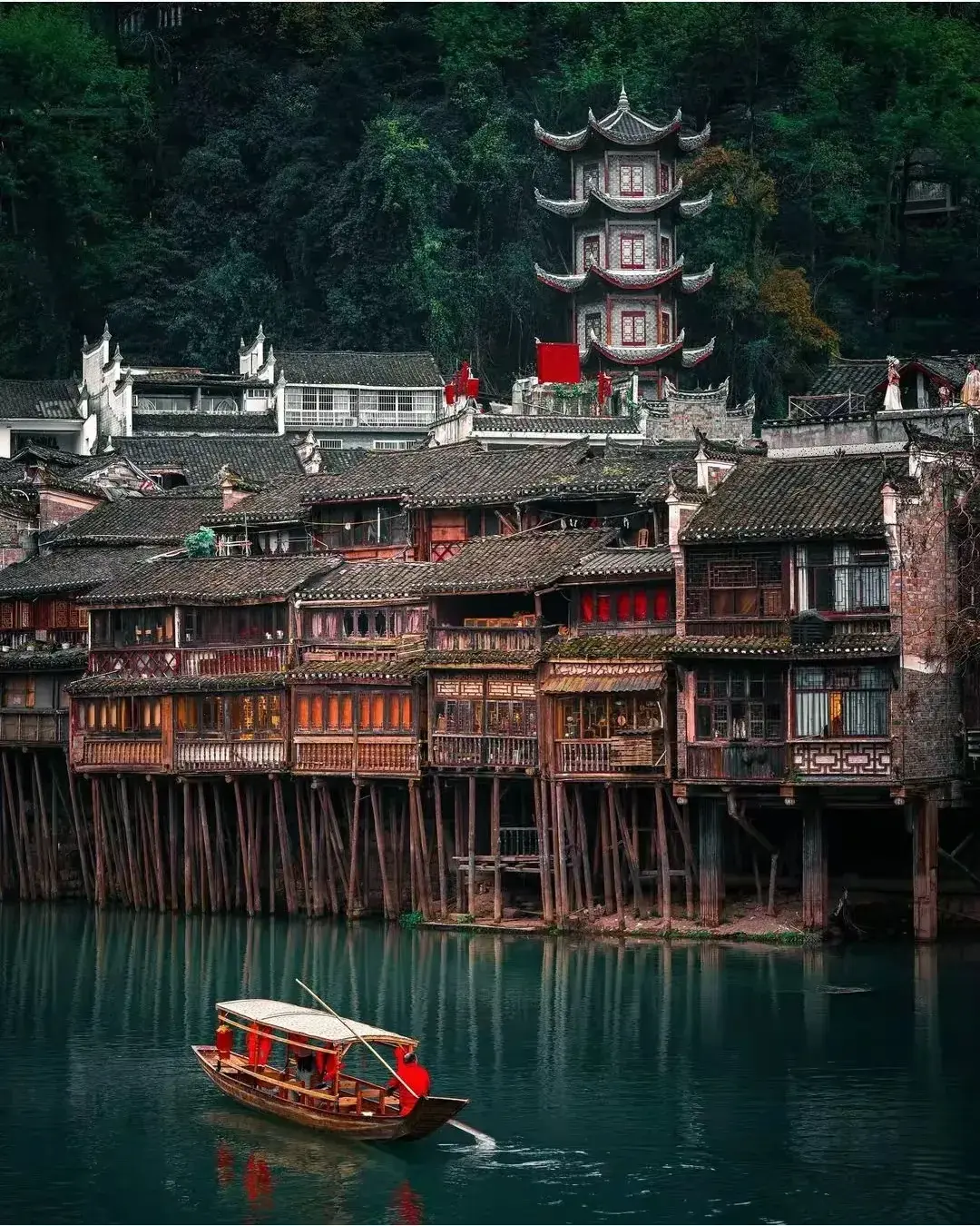 古城中以吊脚楼和木质建筑为主,依山傍水而建,错落有致,吊脚楼一半悬于沱江之上,别具特色,是凤凰古城的标志性景观。