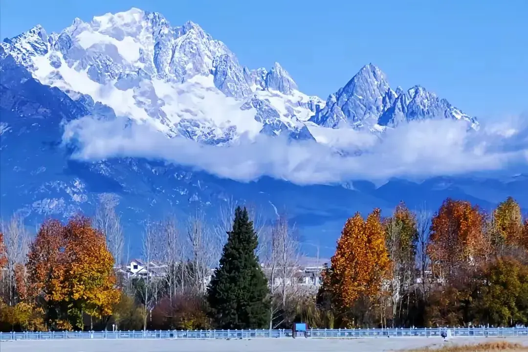 站在古城东大街可遥望玉龙雪山,其壮丽景色与古城相互映衬。