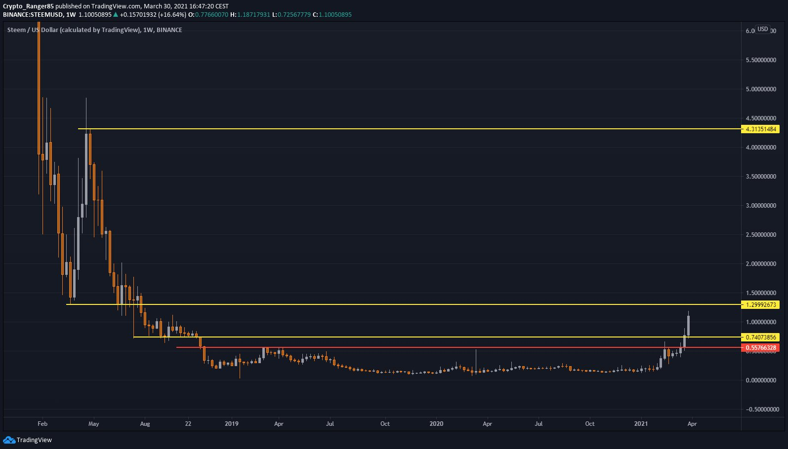 With STEEM already hitting both $.74 and $1.29, the prior two price targets were hit.