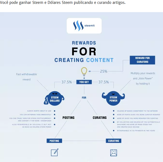 Você pode ganhar Steem e Dólares Steem publicando e curando artigos.