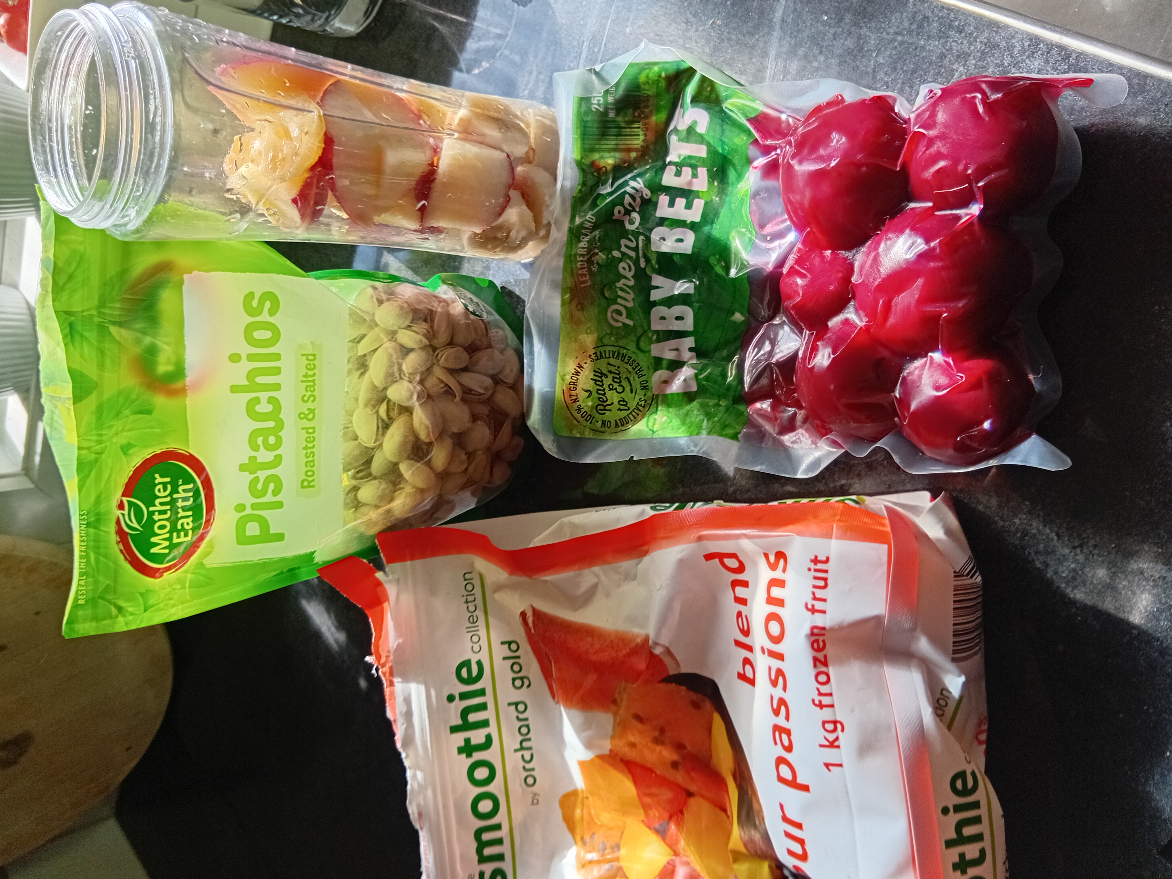 Todays smoothie i just had was a very nice one with some baby beets added to the mix, i had 🍎🍌Feijoa with some frozen fruit, added some pistachio's and finally a baby beet.