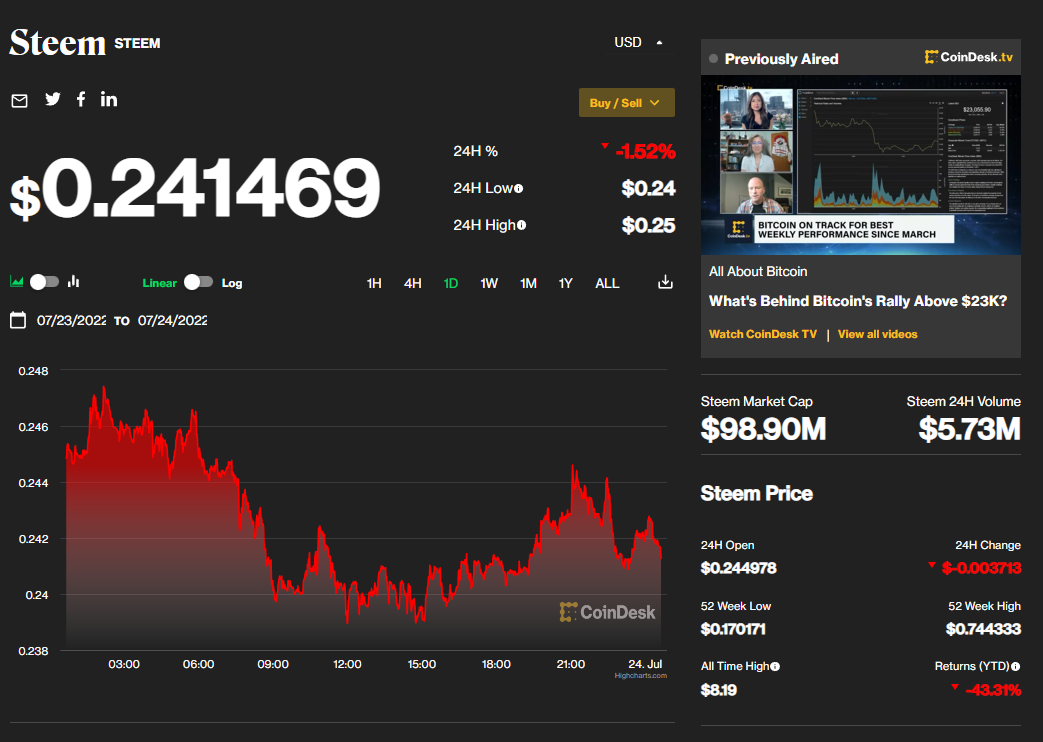 The token again rose in the crypto bull market of 2021, hitting $1.41 in the second quarter, crashing to 23 cents in the summer, and briefly rising to 75 cents in the fourth quarter. When the crypto market crashed even harder in May 2022, STEEM fell as low as 18 cents, a 97% retreat from its all-time high in January 2018.