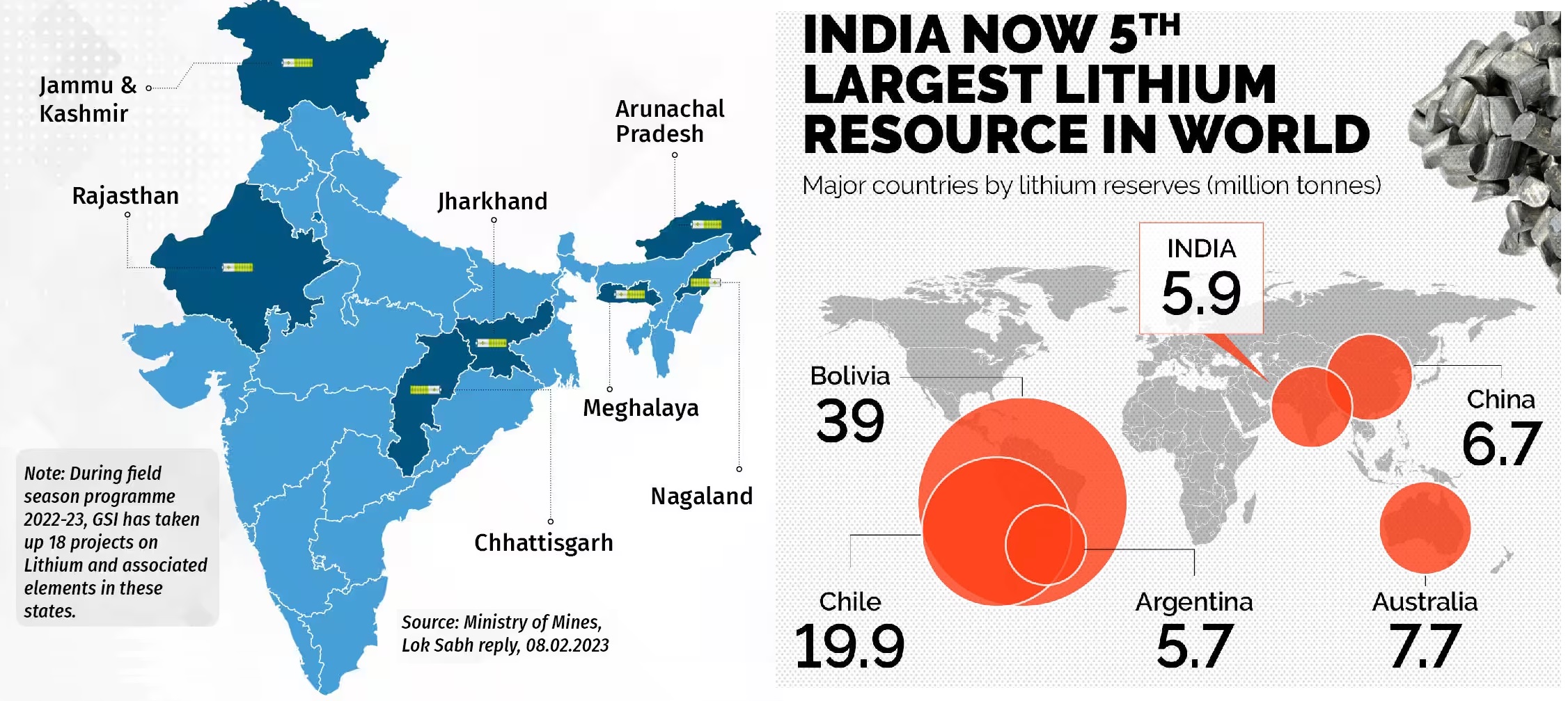 리튬은 주기율표에서 가장 가벼운 금속으로, 현대 기술에서 가장 필수적인 재료 중 하나가 되었습니다. 리튬은 보통 배터리, 전기 자동차, 스마트폰 및 기타 전자 기기에 사용됩니다. 인도는 리튬의 중요한 생산국은 아니지만, 최근 국내 리튬 광산 발견으로 인해 인도의 미래에 대한 기대감과 잠재력이 생겨났습니다. 인도는 리튬의 공급량이 제한적이지만, 카르나타카 주에서 대규모 리튬 광물 발견으로 인해 정부와 산업계에서 기대감을 가지고 있습니다. 인도 국립 지질 조사소는 카르나타카 주의 광산에 14,100톤 이상의 리튬이 포함되어 있으며, 이는 최소한 몇 년간의 인도 수요를 충족할 수 있습니다. 인도 내 리튬 광물 발견은 인도의 수입 의존도를 줄이는 것뿐만 아니라, 미래를 위한 가능성을 열었습니다. 2019년 인도는 주로 호주와 칠레에서 23,000톤 이상의 리튬을 수입했습니다. 수입 의존도가 높아지면 리튬 비용이 증가할 뿐만 아니라 인도는 공급망 위험과 시장 불확실성에 노출됩니다. 인도는 교통 부문 전기화를 추진하기 위한 목표를 가지고 있어 리튬을 대규모 소비자로 만들 가능성이 있습니다. 인도 정부의 국가 전기 모빌리티 미션 플랜 (NEMMP)은 2020년까지 6~7백만 대의 전기 및 하이브리드 차량을 도로에 출시하는 것을 목표로 하고 있습니다. 이 계획은 인도 정부가 탄소 배출을 줄이고 화석 연료에 대한 의존도를 감소시키기 위한 노력의 일환입니다. 리튬 수요는 앞으로 급격하게 증가할 것으로 예상되며, 인도 내 리튬 광물 발견은 인도 경제에 큰 영향을 미칠 수 있습니다. 리튬은 인도의 외환 보유액에 매우 필요한 효과를 줄