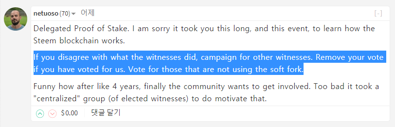2020년2월24일 새벽에 벌어진 0.22.2소트프포크(https://steempeak.com/steem/@softfork222/soft-fork-222)에서 대다수 스팀 메인증인들(20 명 중 18 명 찬성)이 이번 소프트포크를 지지한다고 선언했으며, 이같은 행동은 스팀커뮤니티의 대다수의 의견이 반영되었다고 주장하고 있습니다.