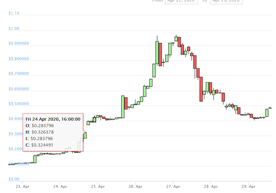 The price fell from 95 cents all the way to 45 cents where it's currently hovering at. It rebounded slightly but don't let that fool you. It will most likely keep dropping, probably to pre-pump levels (10-15c)