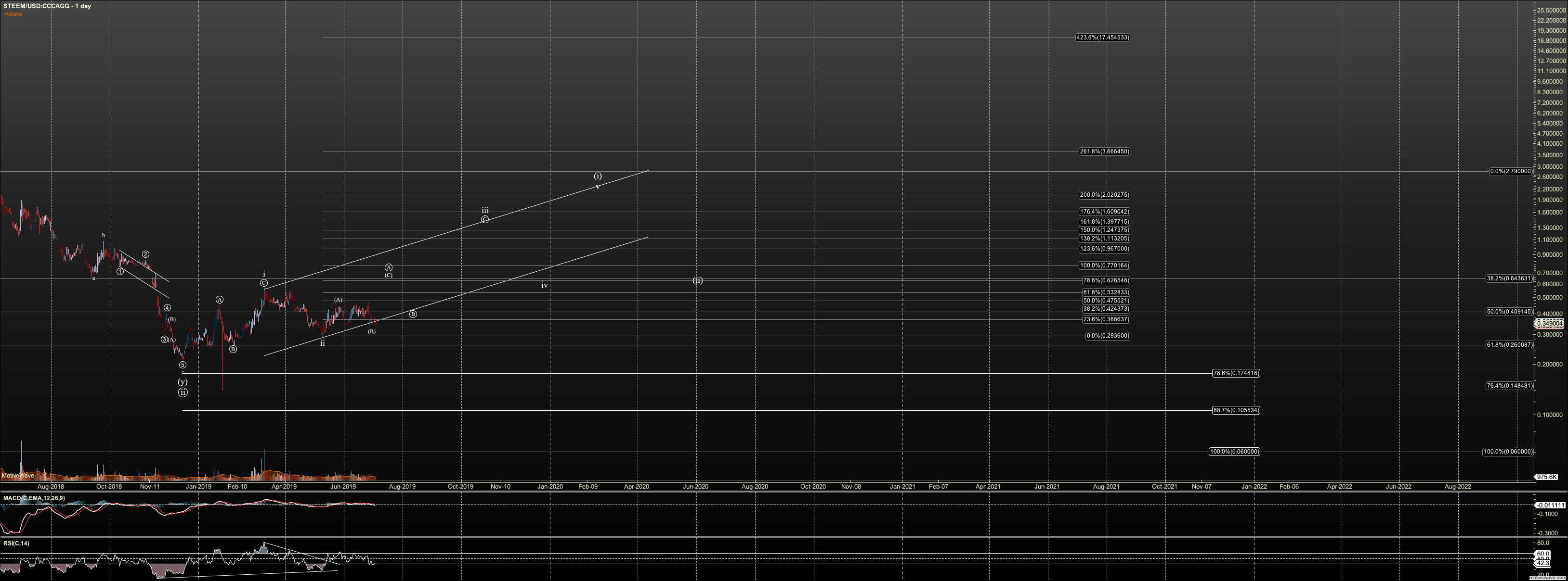 Needless to say the Steem price has been very disappointing given the strong push in the price of Bitcoin. I am tracking this diagonal that fits within the long term view I've posted here for a long time. However, this is seen through rosey eyed classes and is not the most bullish of patterns. I now only hold enough STEEM to be active on Steemit, but nothing more.