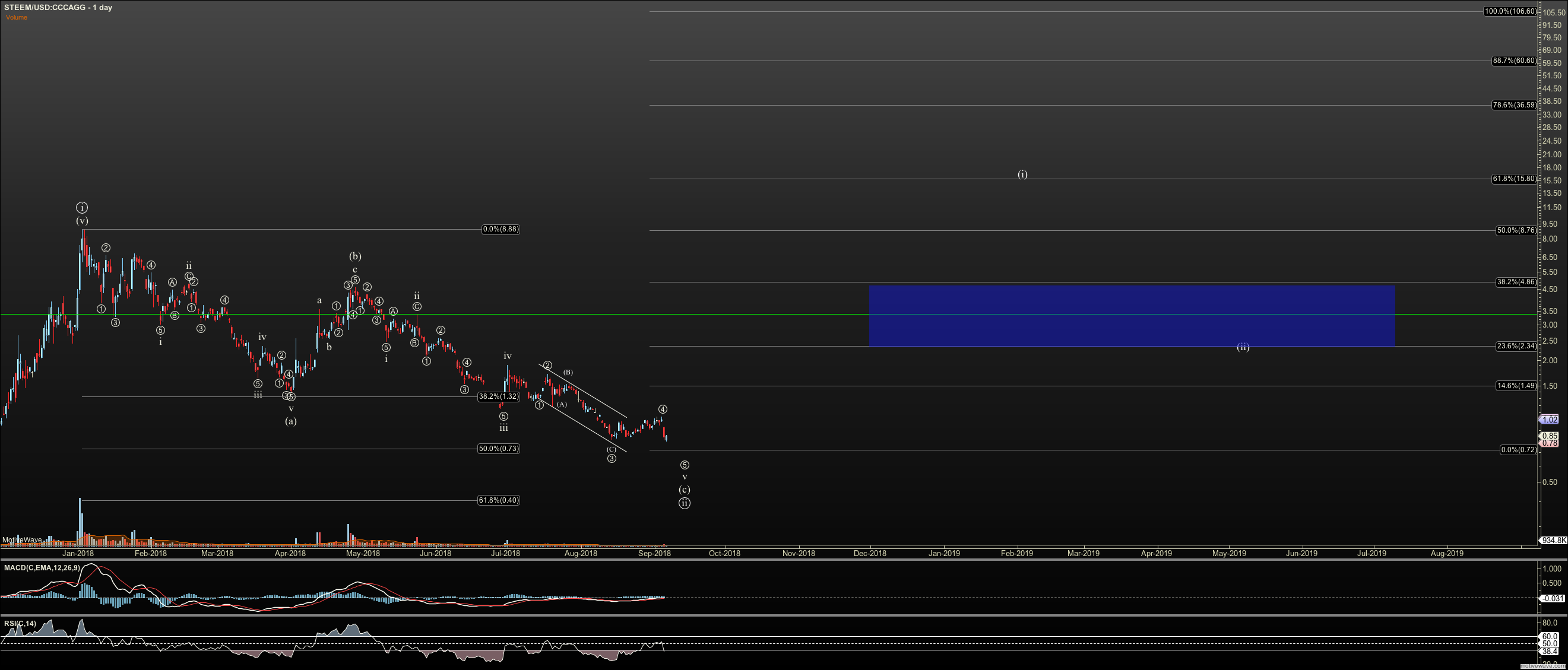 STEEM is one of the first coins I've spotted that has a completed bottom pattern, completely filled in, in this correction that started in Juanuary. While we can still see an extended fifth down, we have hit my target at the 73-75 cents range. Now, I need to see a completed impulse up to $2.34. If so, then I hold out the $15 to $17 as key in the larger weekly count which is expected to eventually see three figure levels.