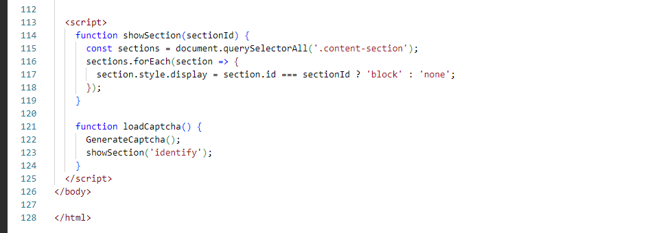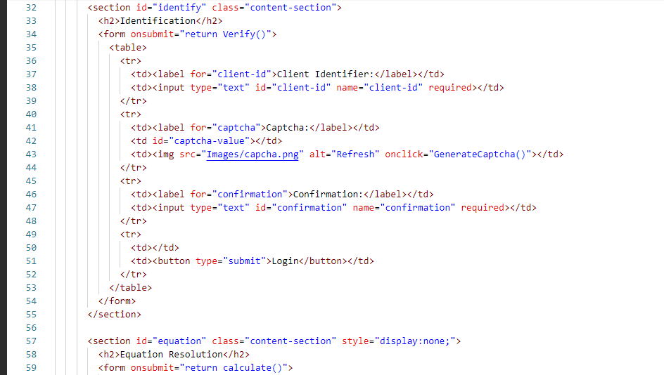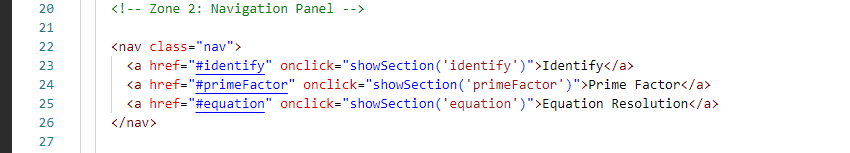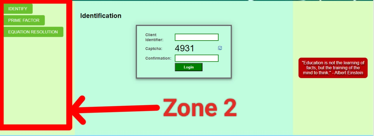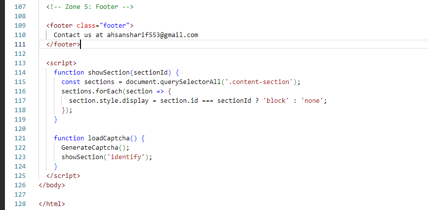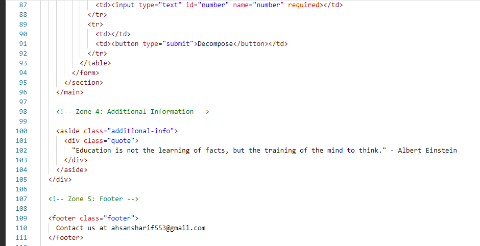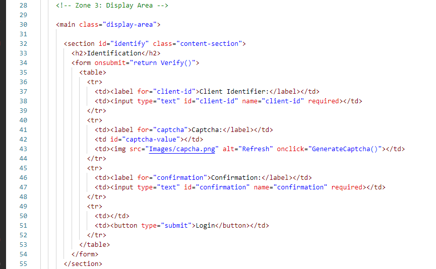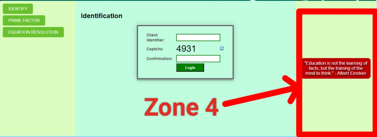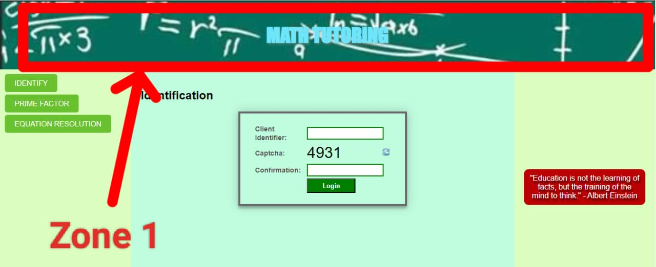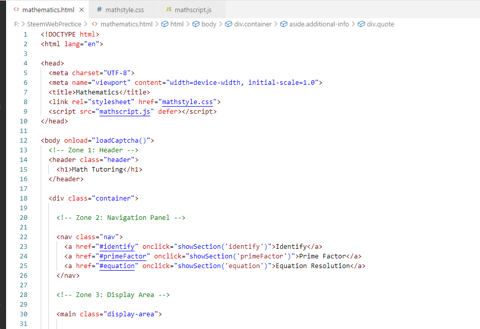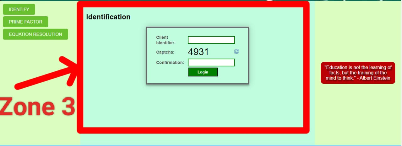 The third zone is our zone which shows us in the middle. Which we know as a display area. It will have all our type of equations solo in which we have also added a captcha where we are see everything from identification confirmation. Our third zone is where we have to solve the equation as well as check the prime factor and we have to login to the user. This is our third zone, we first created it using HTML and then designed it using CSS. In which we set its background color, padding, and width, and align items to the center. Similarly, we have given the background color and redid it nicely. We also added JavaScript.