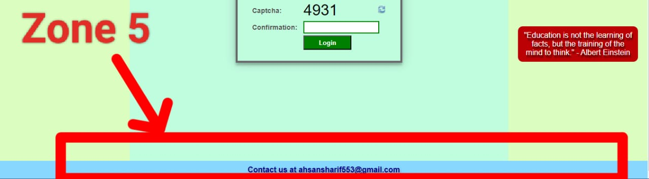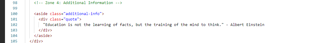 The last zone of our main content is zone number four. In which we have added a quote by Einstein. Which is an informative Einstein quote with which we are covering our area anyway. This has nothing to do with this layout but we are using this code to complete our zone four so we can complete our zone. It is being shown to us on our right side which is written in red color with white color text. We'll call it Zone Four, so we've used HTML and CSS and designed it.