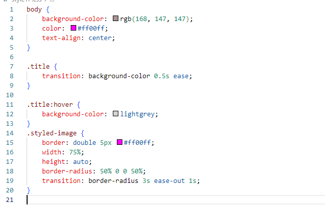 Ap ka code achy sy documented kia hoa ha jis sy samjhny me asani ho rhi ha... Exercise 1 me choti bt me btana chahon ga agr ap mind na kren jisy ap abi thk kr skti hain wo border corners hain jo dono opposite sides pe hngy aur hover krny pe dosry sides pe chaly jaen gy... mtlb top left bottom right shuro me aur hover pe top right bottom left ho jaen gy...me ne b assignment krty hoa galat read kr lia tha then dbra parha to pta chala dono aik side pe ni opposite side pe krny hain...