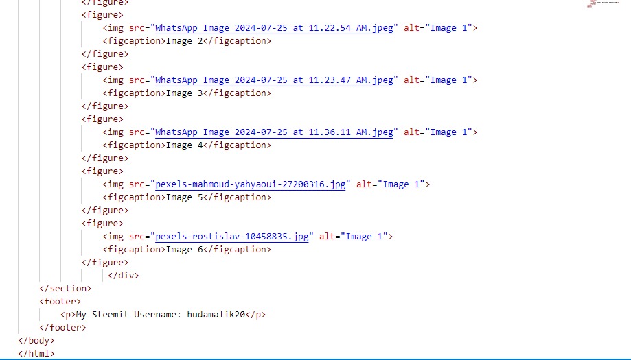 Exercise 2 me ap ne div use ki ha jis me figure aur figcaption ko div me put kia ha ta k code well structured lgy aur parhny me b asani ho rhi ha... Ap ne last me output share ki ha video k through jis me saaf pta chal rha ap ne homework complete kia ha aur mehnat ki ha. Mjhy ap ka code well structured lga aur output of exercise 2 homework k according bnai ha. Me umeed krta hn hm sb in lessons sy improve hoty jaen gy InShaAllah. JazakAllah :)