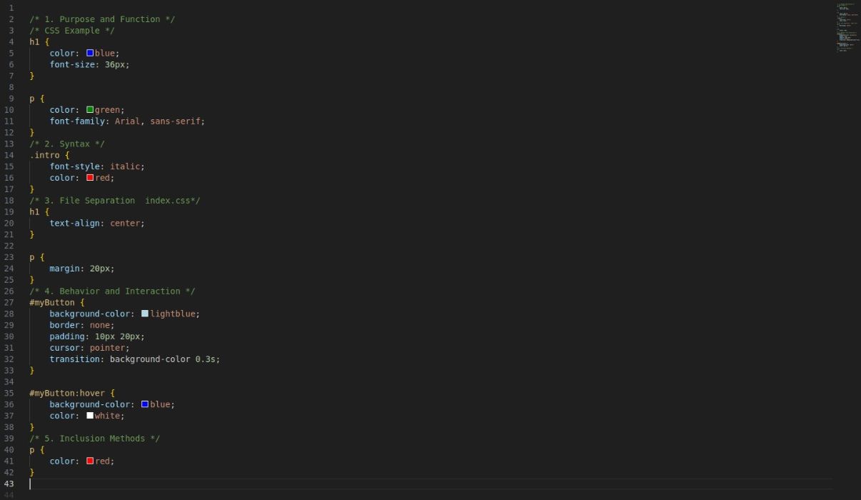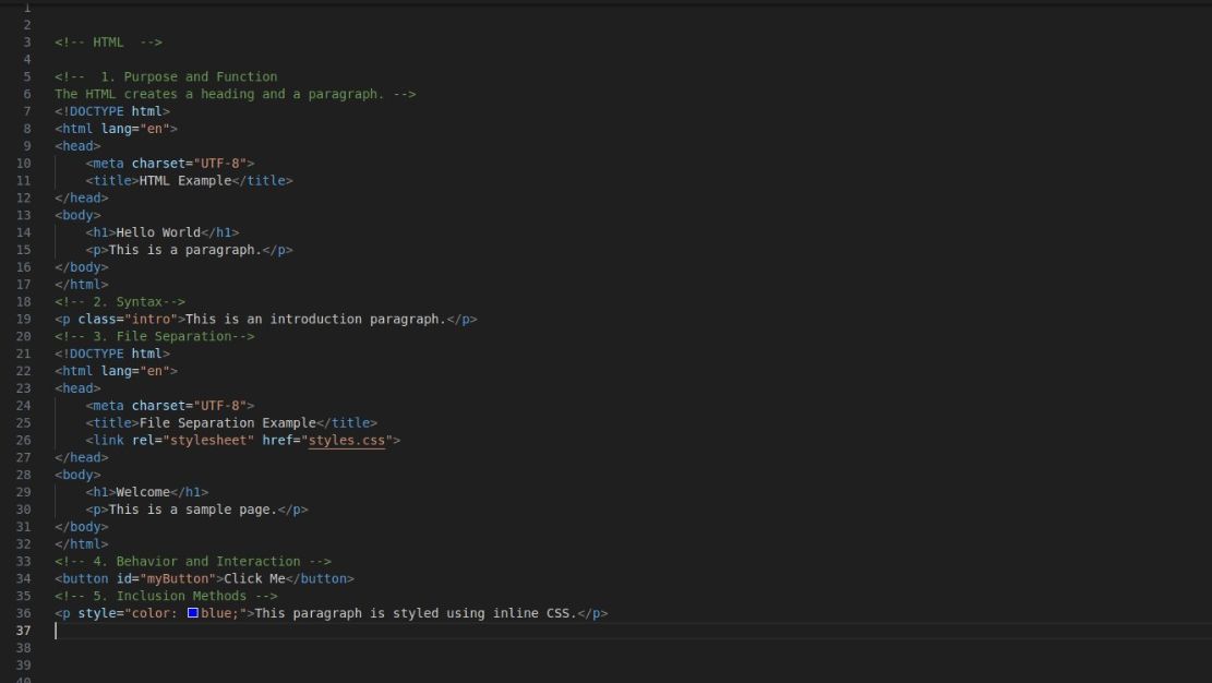 | Functions | It focuses on the structure and semantics of web content. It organizes content in a proper sequence using elements like < header >, < footer >, < article >, and < section >. | It focuses on the visual presentation. It styles elements by changing their appearance using properties like color, font-size, margin, padding, and border. |