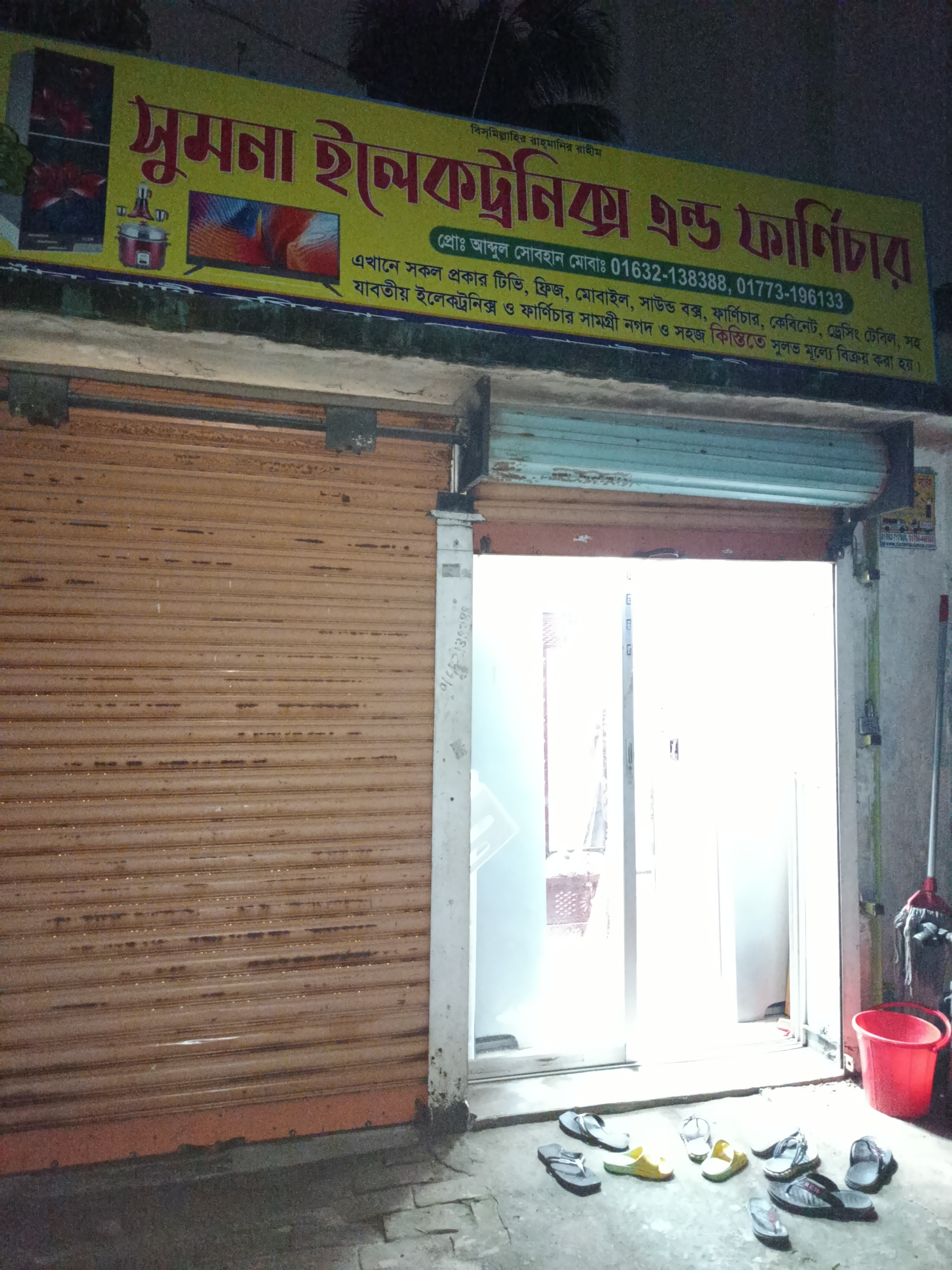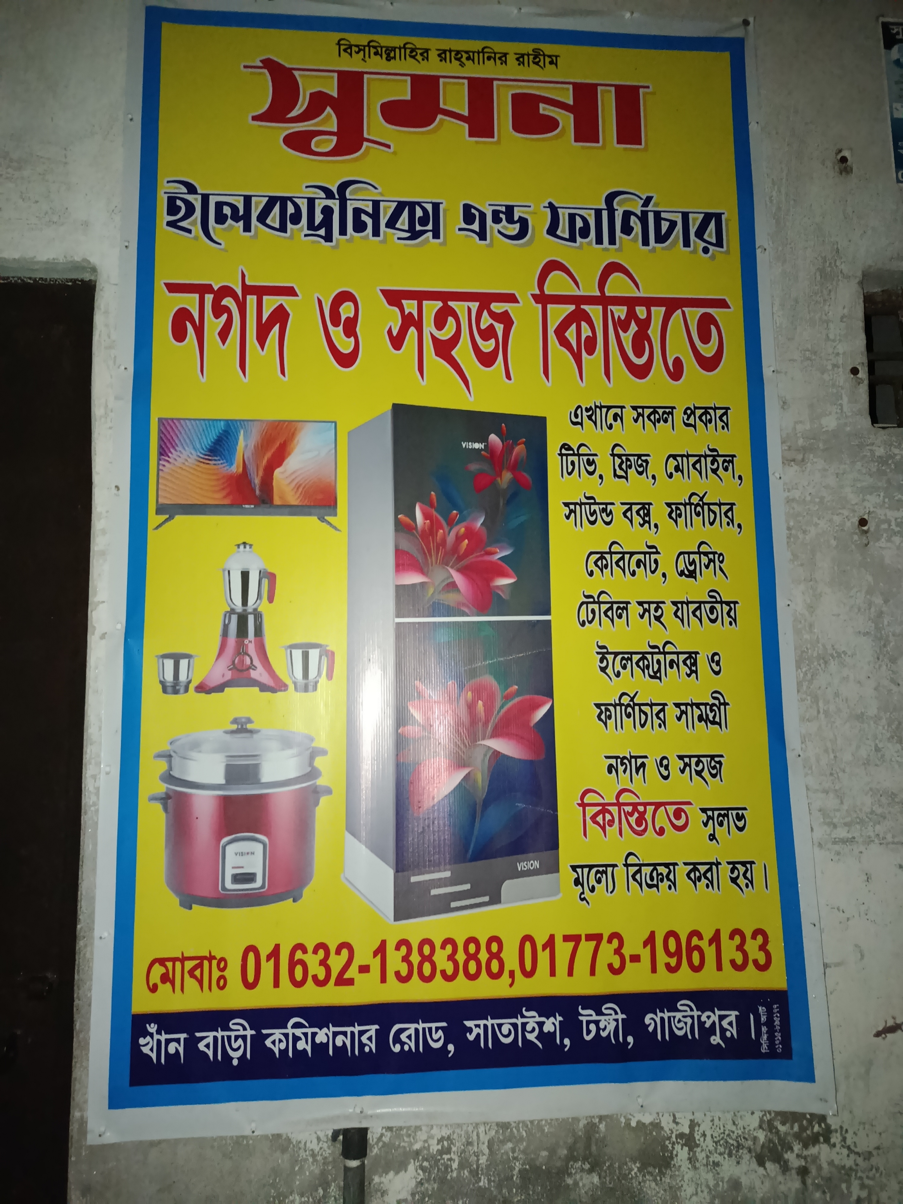 The shop that I will visit is Sumna Electronics and Furniture Shop. The shop's name is Md. Abdul Sobhan. The shop is a readymade furniture shop. Furniture is made from other places and sold in this showroom. This showroom is located in Tongi Paschim Thana 27 Madhyapara, Gazipur district. The shop is located a little inside the alley from the main road. However, the shop has facilities for motorcycles, rickshaws, vans, pickup vans, private cars to move around.