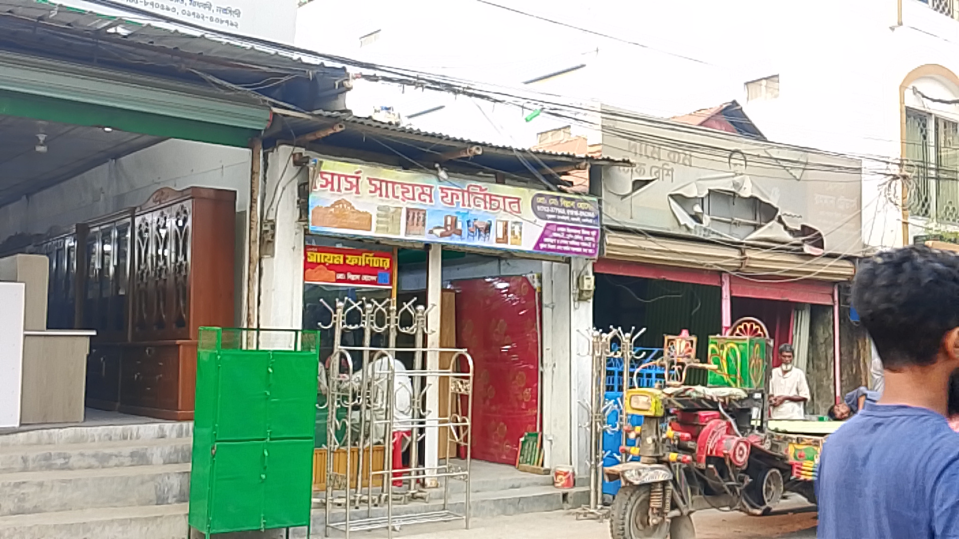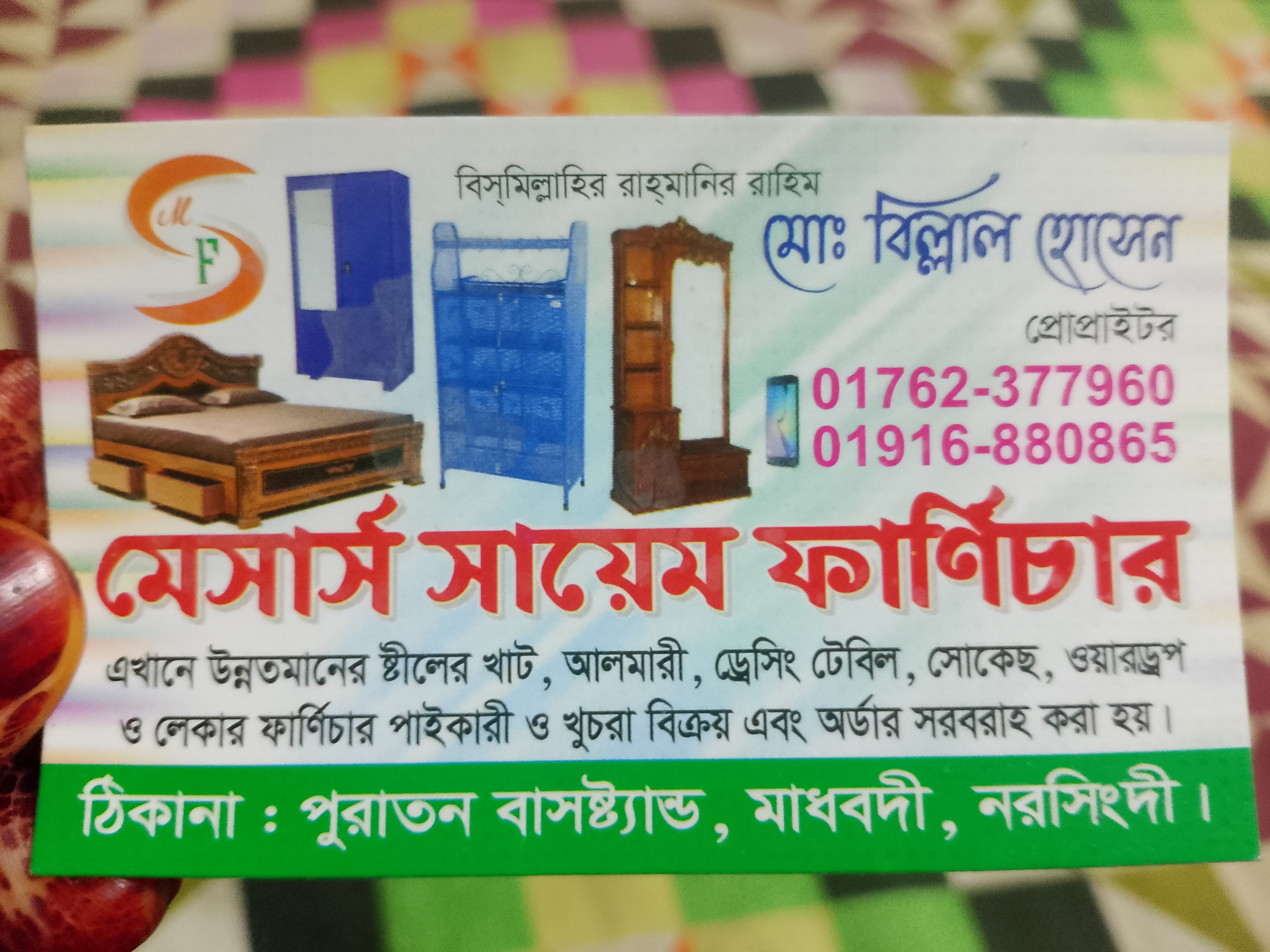 Messrs Sayem Furniture is a local furniture shop. This area is known as one of the main commercial centers of Madhabdi.The store established three years ago in 2023.The shop has been operating its business in this area for several years. It sells high-quality steel beds, cabinets, dressing tables, showcases, wardrobes, and lacquer furniture both wholesale and retail. Additionally, furniture is supplied through orders. The founder of the shop is Mohammad Billal Hossain, but he operates the shop in his son's name, Sayem. They have a specific card for communication regarding their shop.