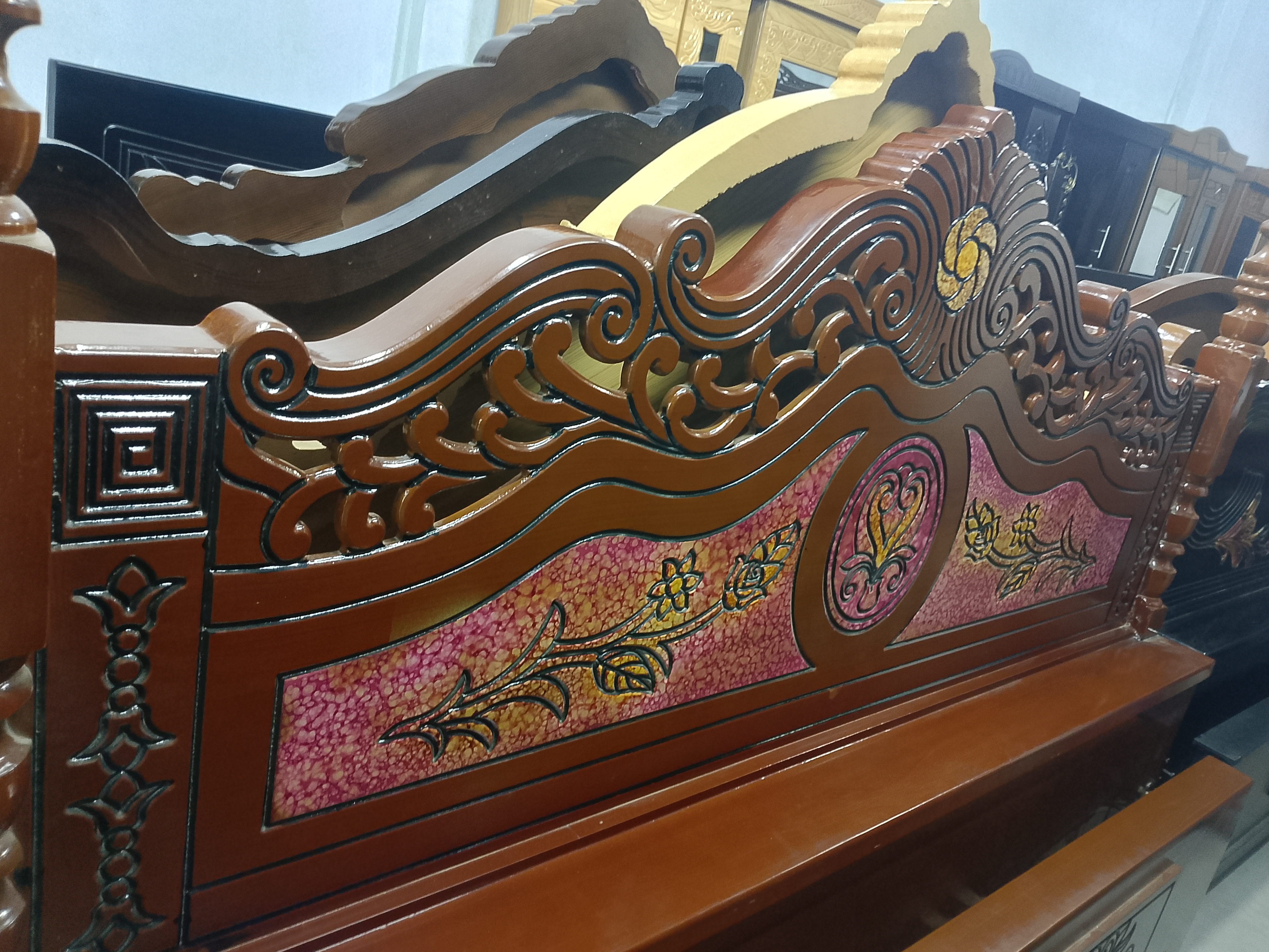 This is a beautifully designed wooden bed headboard, or the part that is at the head of the bed. It has wavy carvings on the top and a circular floral design in the center. The main attraction of the bed is its central panel, where a floral art or batik style design is done in a blend of pink and gold colors. It brings a touch of elegance to the bedroom. It is part of a box bed or semi-box bed. Such beds are currently very popular.