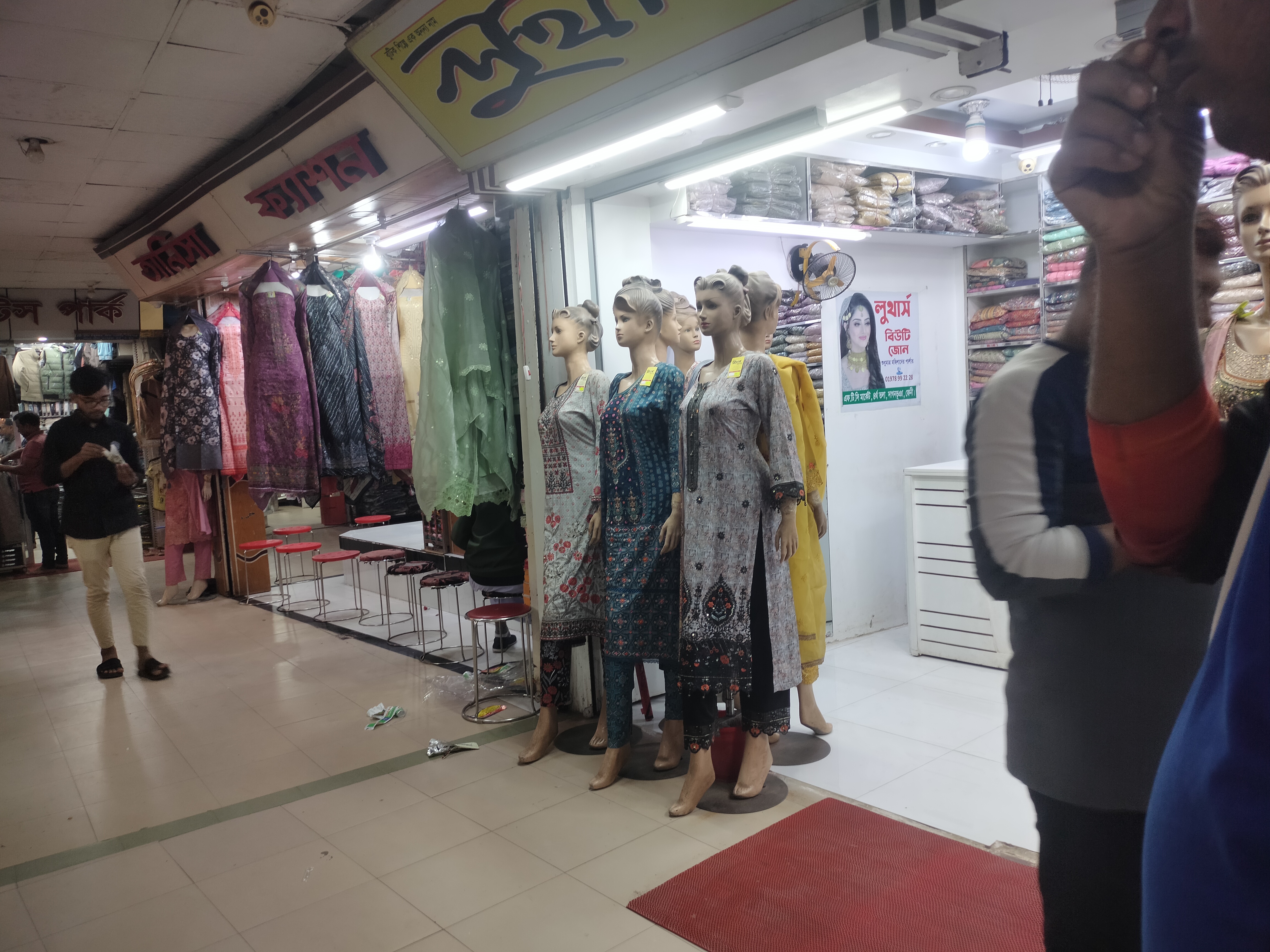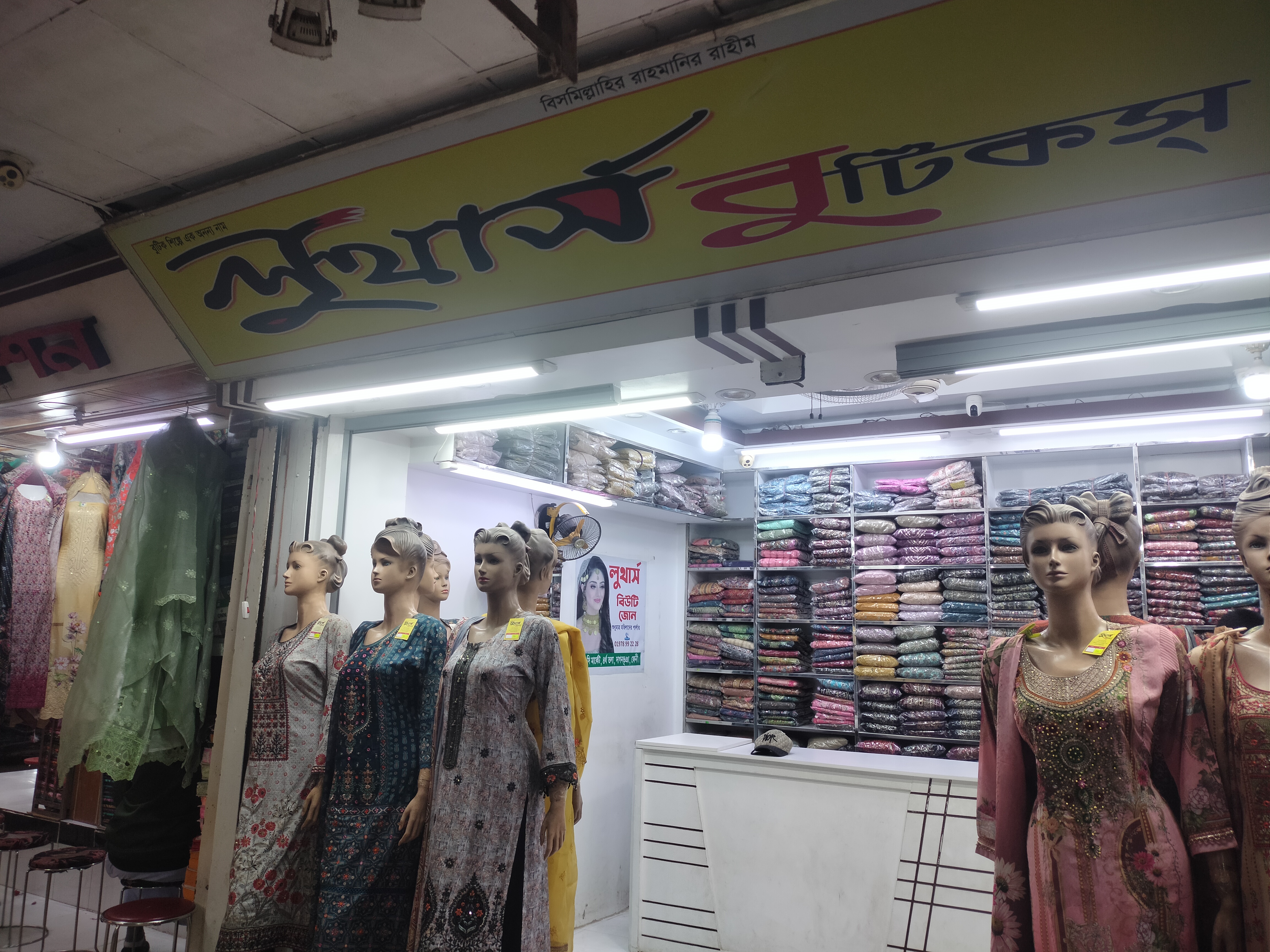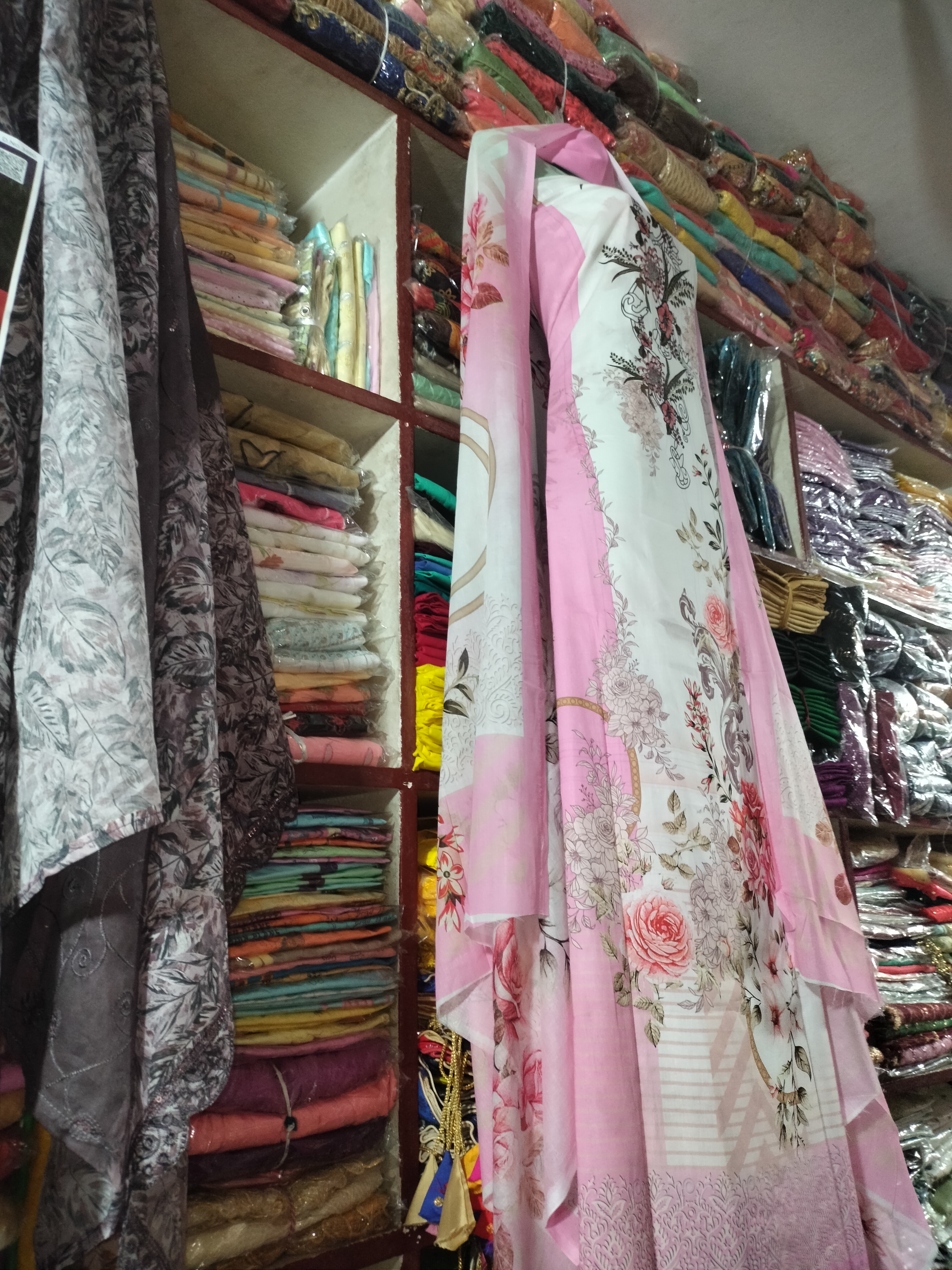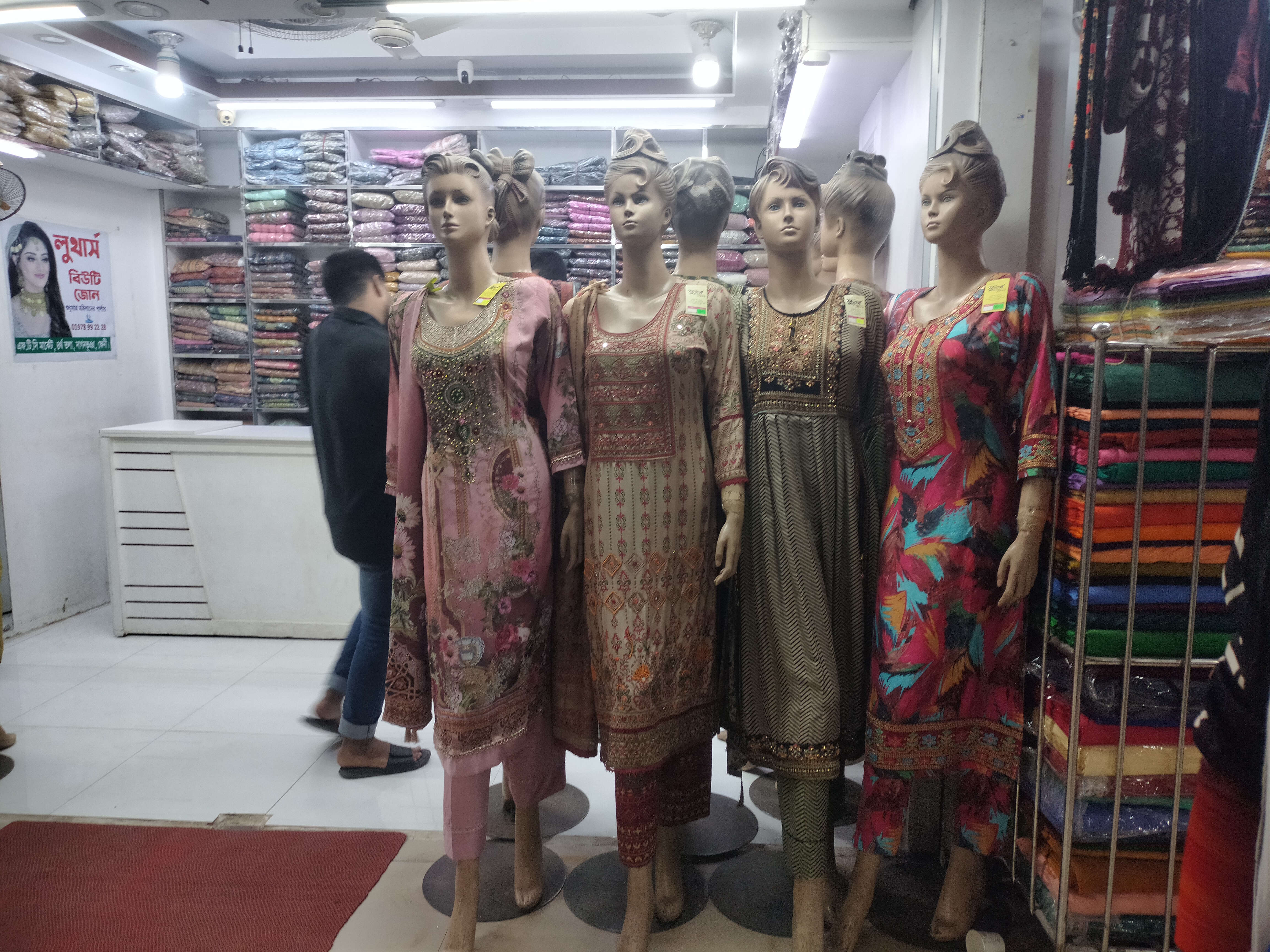This is a clothing store. Where girls' clothes are sold. Here girls' three-pieces, sarees, veils, towels, designer dresses and various types of clothes are sold. And every piece of clothing here is very beautiful, which can be understood by looking at it. There are several dolls outside, which are wearing very beautiful three-pieces. Here you will also get normal three-piece clothes. You will also get cotton fabrics for sewing clothes, pajamas, blouses, petticoats. Here you will get all kinds of clothes very easily.