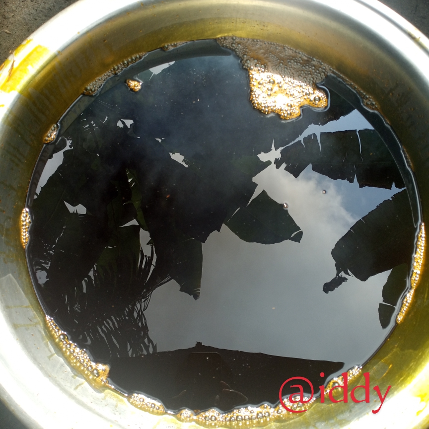Feed The boiler with the raw materials. I fed my boiler with the separated palm fruits and water. I put the palm fruits in the drum and add a suitable quantity of water, then set up the fire with firewood and chaff from palm fruit bunches and cook it until the mesocarp of the palm fruits is softened. When the mesocarp was softened, I filtered the water from the palm fruits.