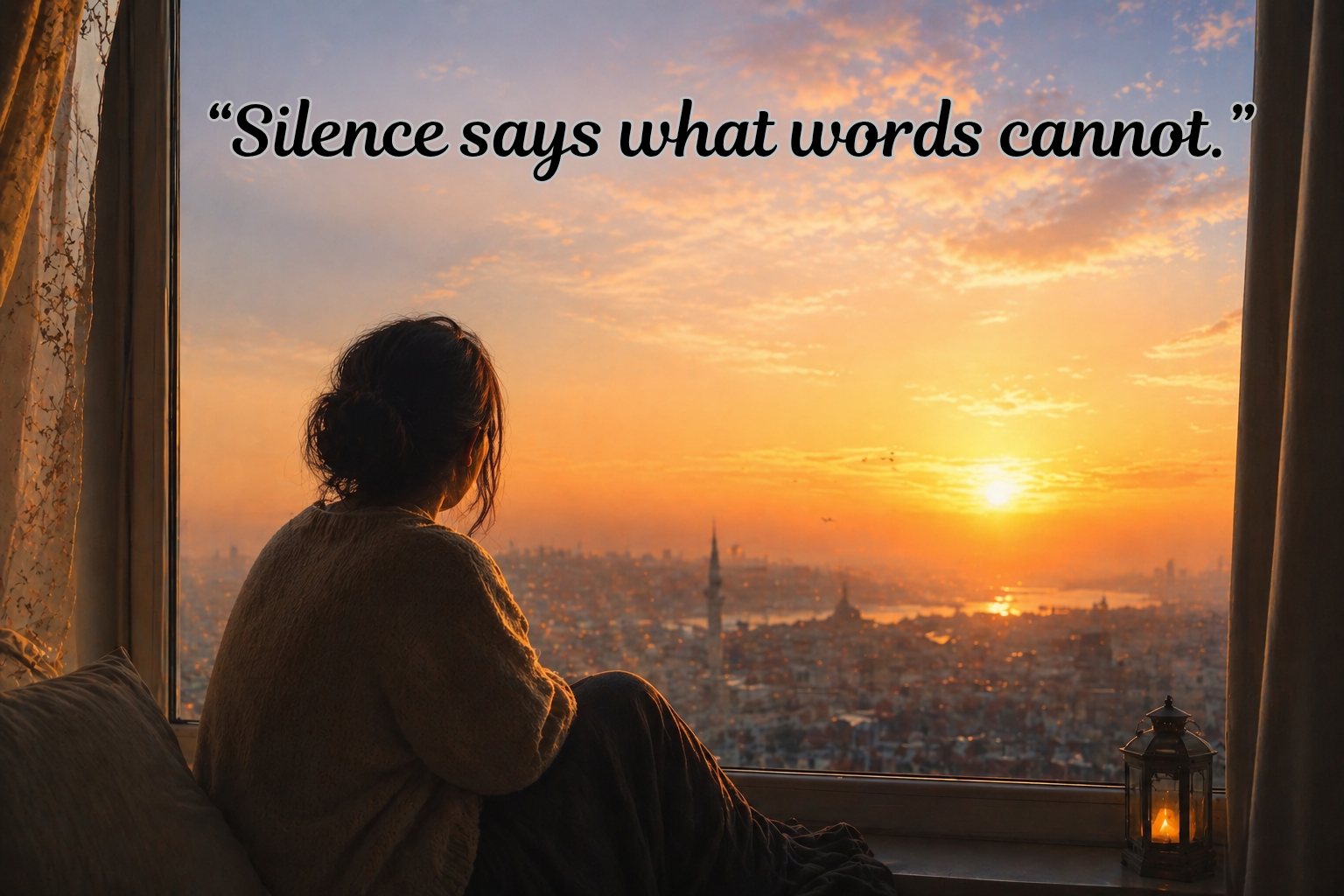 Silence speaks, but without sound. In my imagination, it is a picture where it is evening, the sky is bathed in a pale golden color and a person is sitting by a window looking into the distance. There is complete silence around him, no noise, no conversation, but a whole story is hidden in his eyes. Of that moment the silence feels heavy. It is like time itself has stop to listen to the unspoken words of the heart.