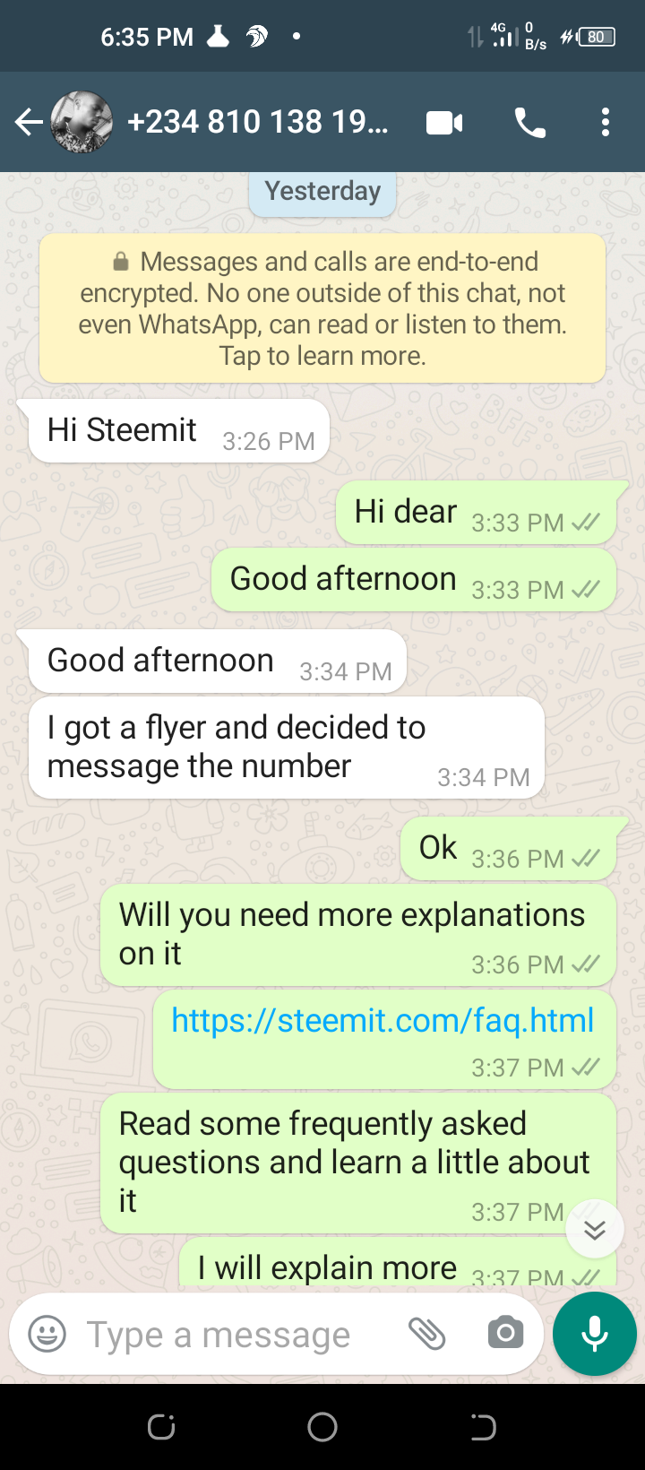 Someone chatted me up on WhatsApp that he/she got my number from the flier we distributed. As at that time I was very busy but I just gave him a link to the frequently asked questions and told him to go through and get back to me. Here is a screenshot of our conversation