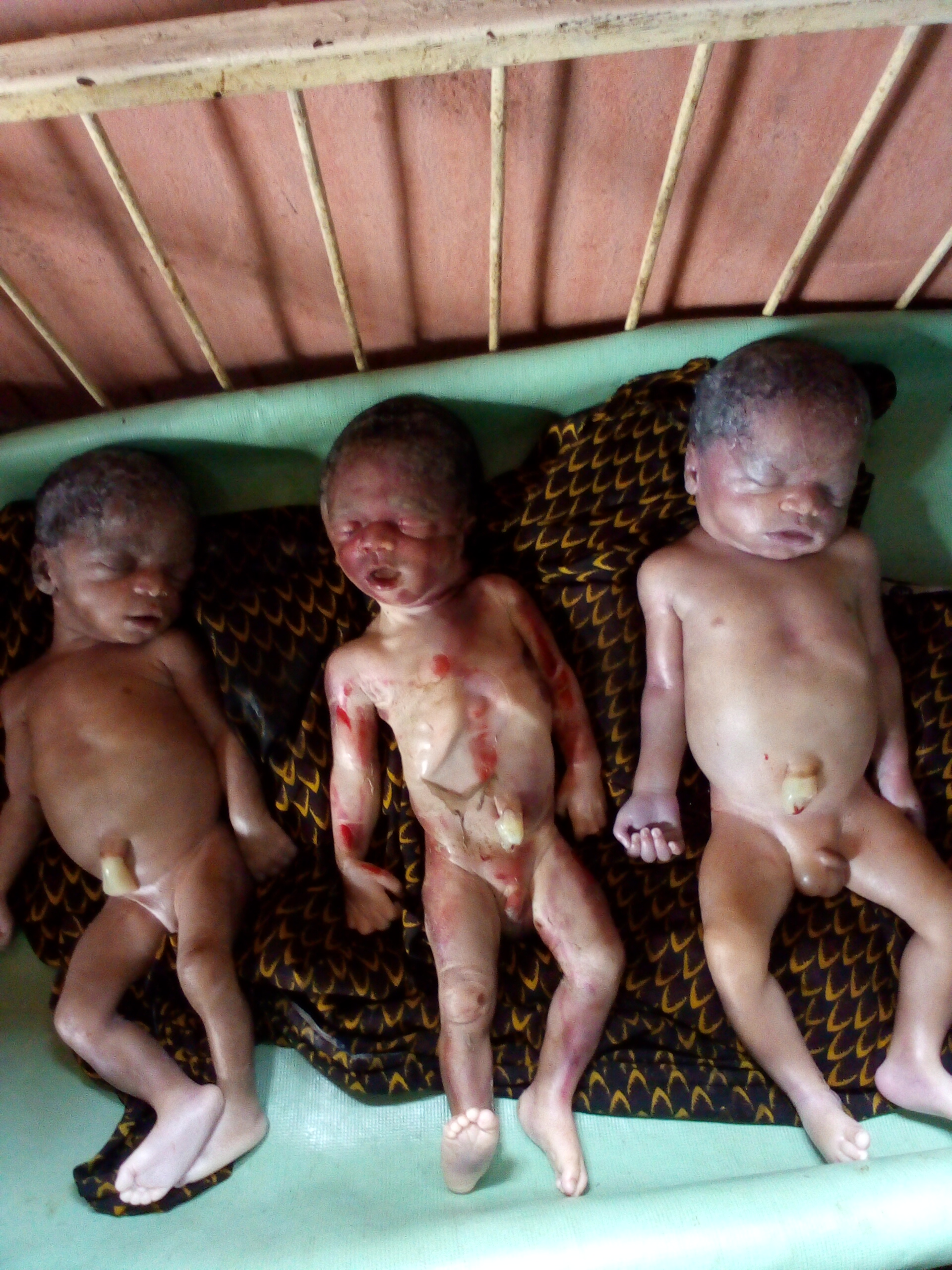 She went to prayer house/deliverance center. She presented to the hospital after more than 48 hours of difficult labour. No scan was done, so no one envisaged twins talkless of triplets.