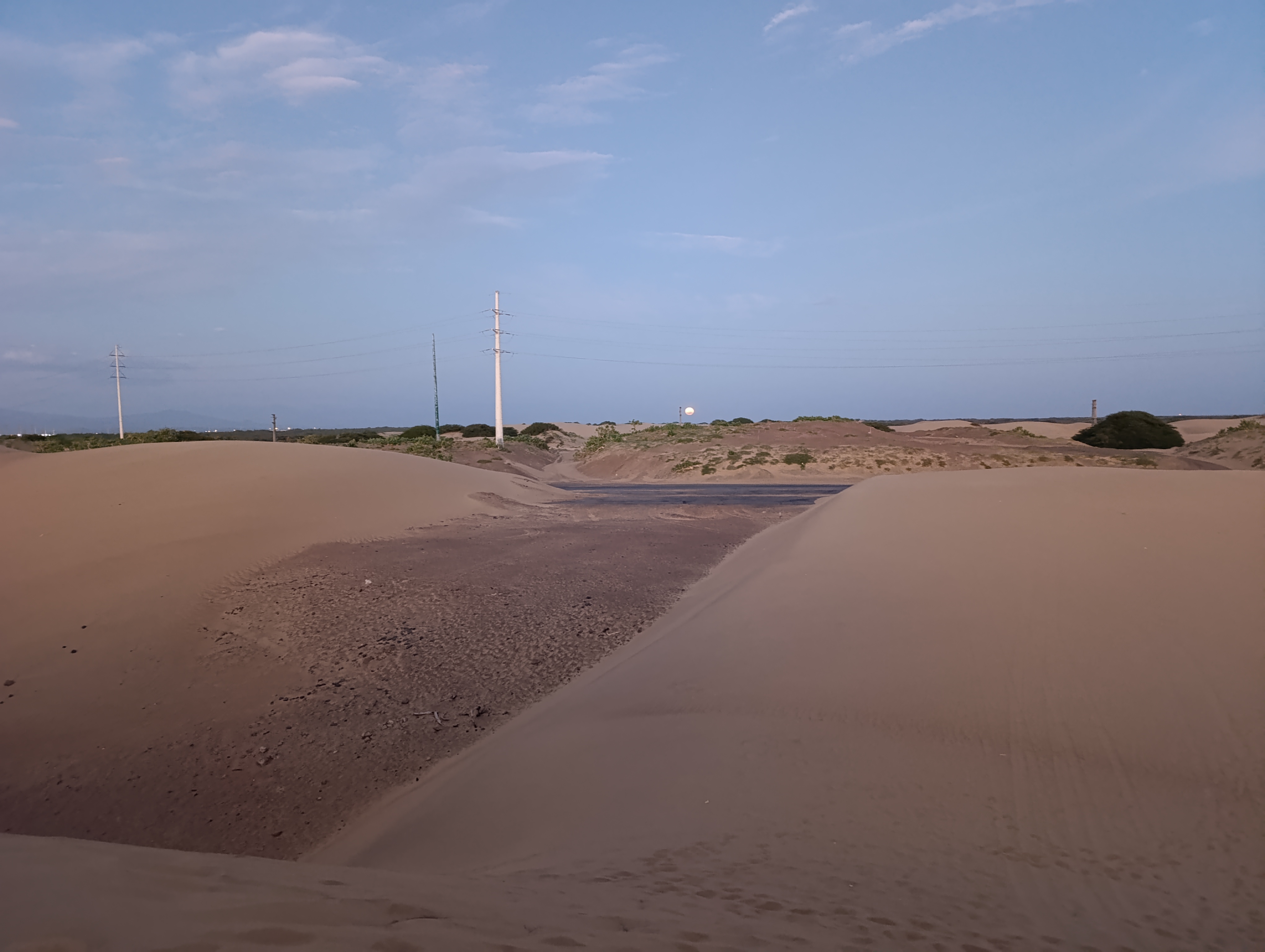 Frecuentemente, las maquinarias limpian la carretera para evitar que la arena obstaculice el paso, como le pasó a la primera carretera que quedó bajo las arenas de los médanos.