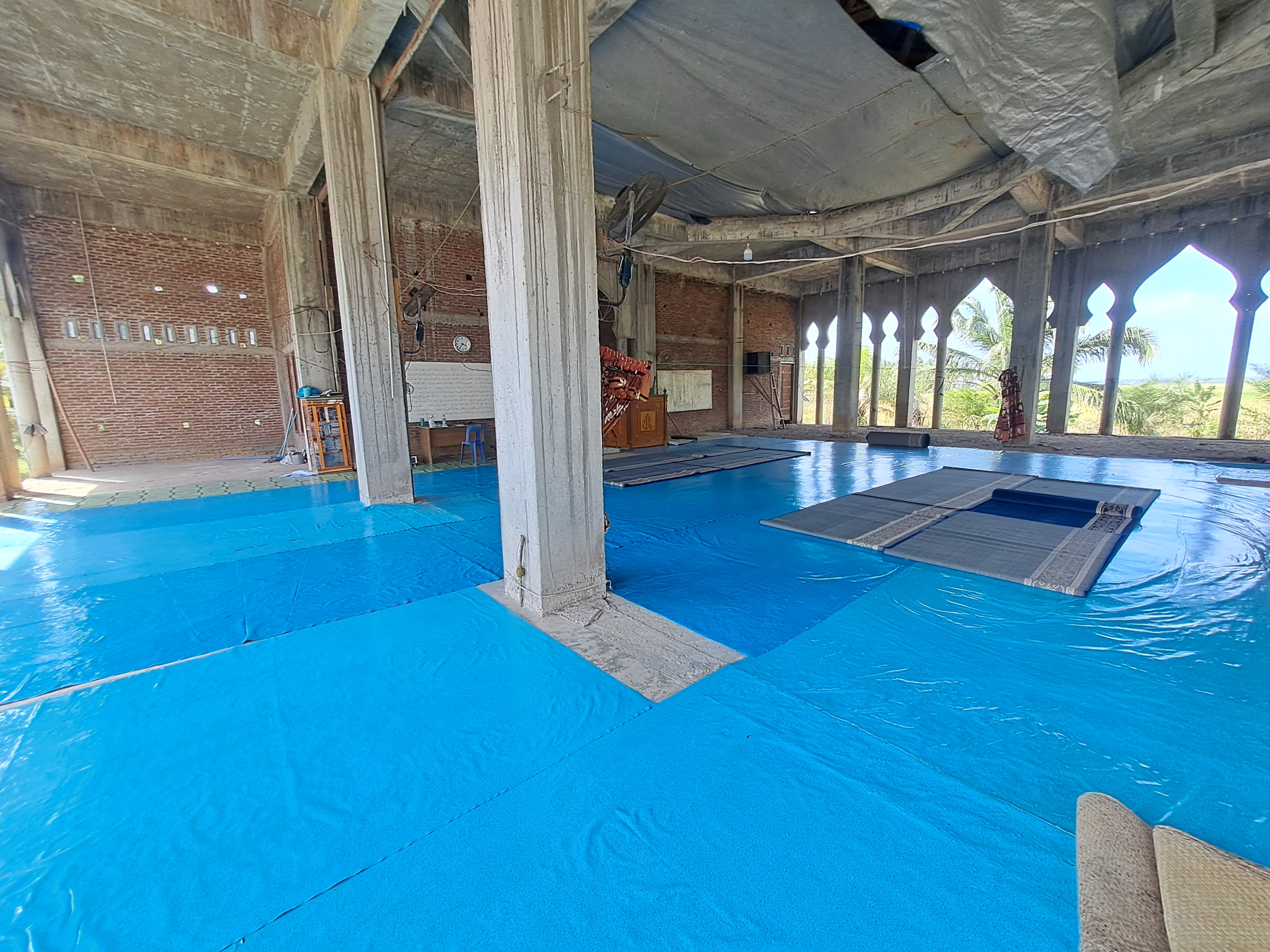 Saat saya masuk ke dalam Masjid ini pada hari ini saya melihat lantai Masjidnya masih sedang dalam proses pembangunan juga, lantai Masjidnya di lapisi dengan terpal dan juga karpet Solat yang bagus sehingga membuat kita bisa menunaikan Solat dengan nyaman, dan karena ruangan di dalam Masjid ini juga di desain terbuka maka bisa membuat kita bisa menunaikan Solat dengan lebih nyaman karena udara segar bisa langsung masuk ke dalam Masjid.