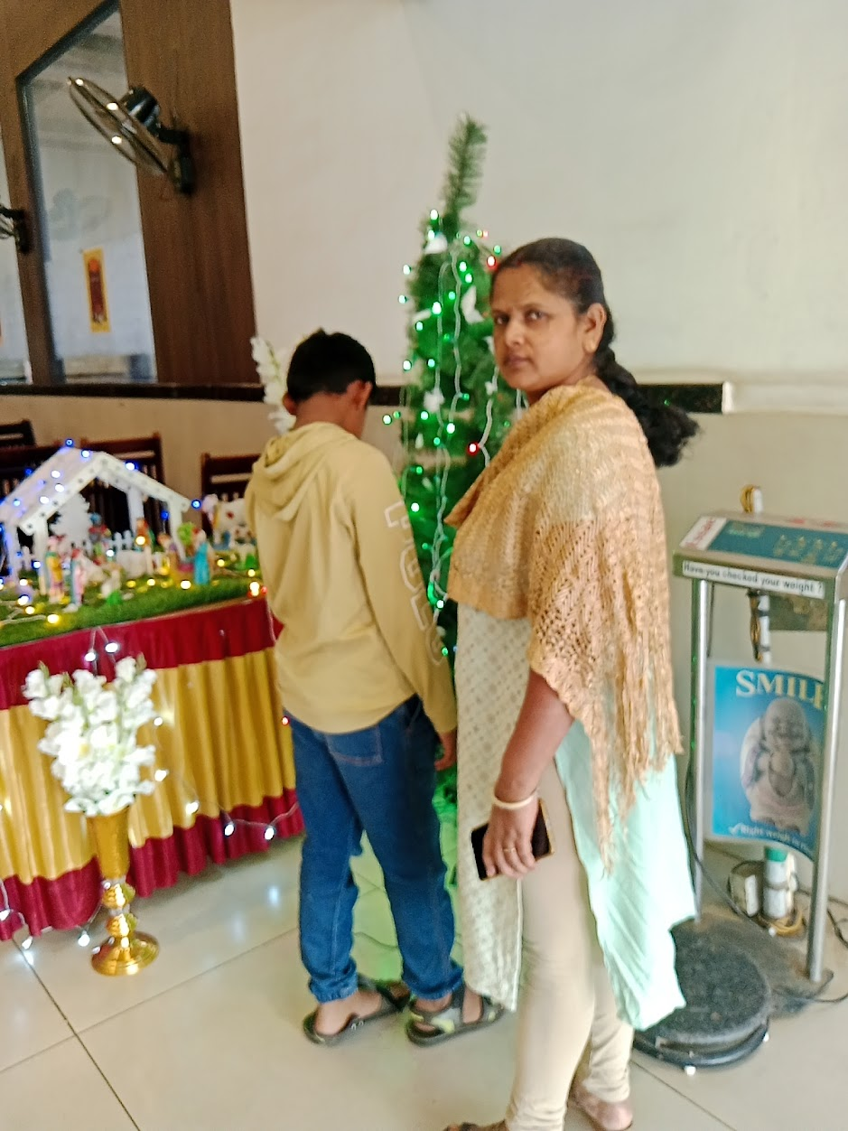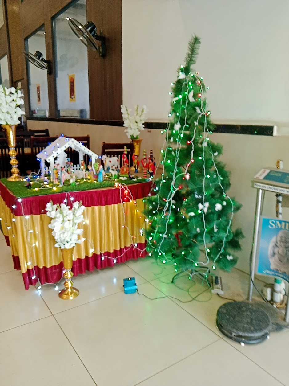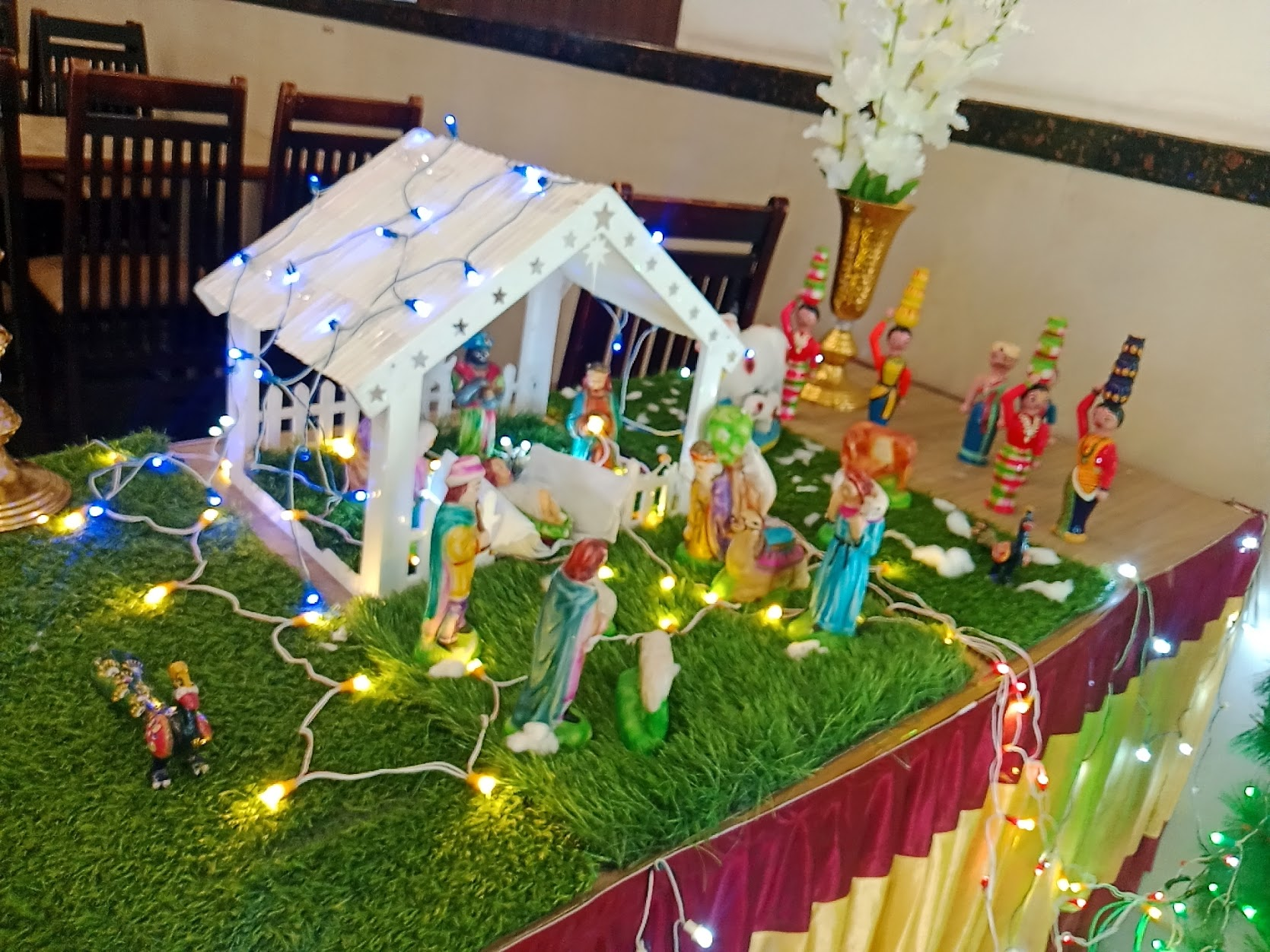 We ordered fried rice and noodles. They served it hot within a short time. The taste was also very good, and we enjoyed our meal. Then, there were miniature statues depicting the birth of Jesus Christ, and next to it was a Christmas tree with lighting decorations. We were happy to see it and took a picture near it.