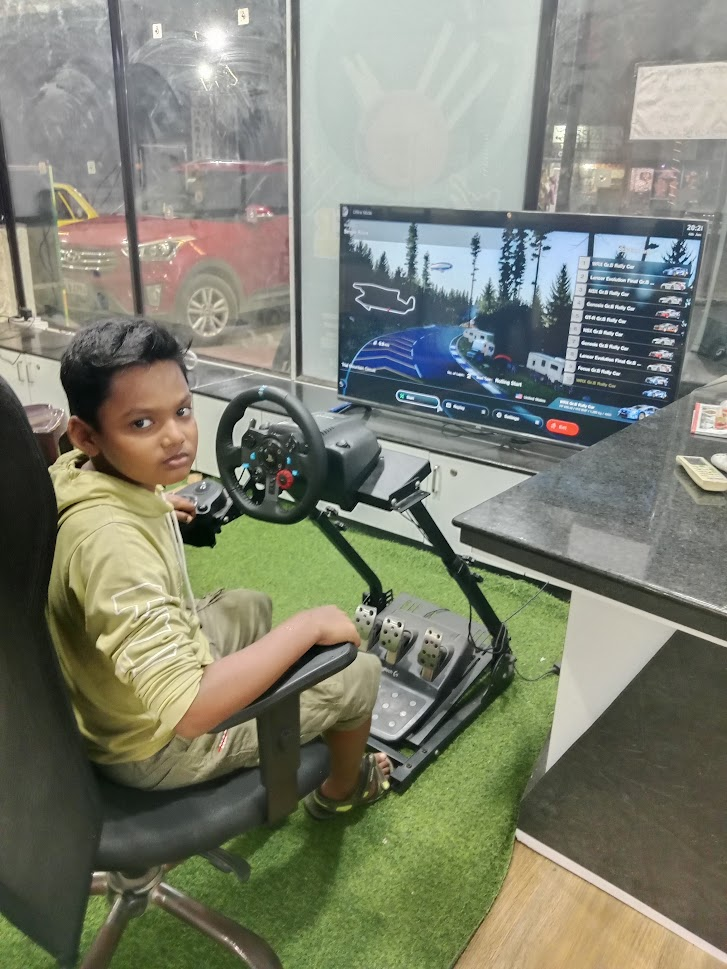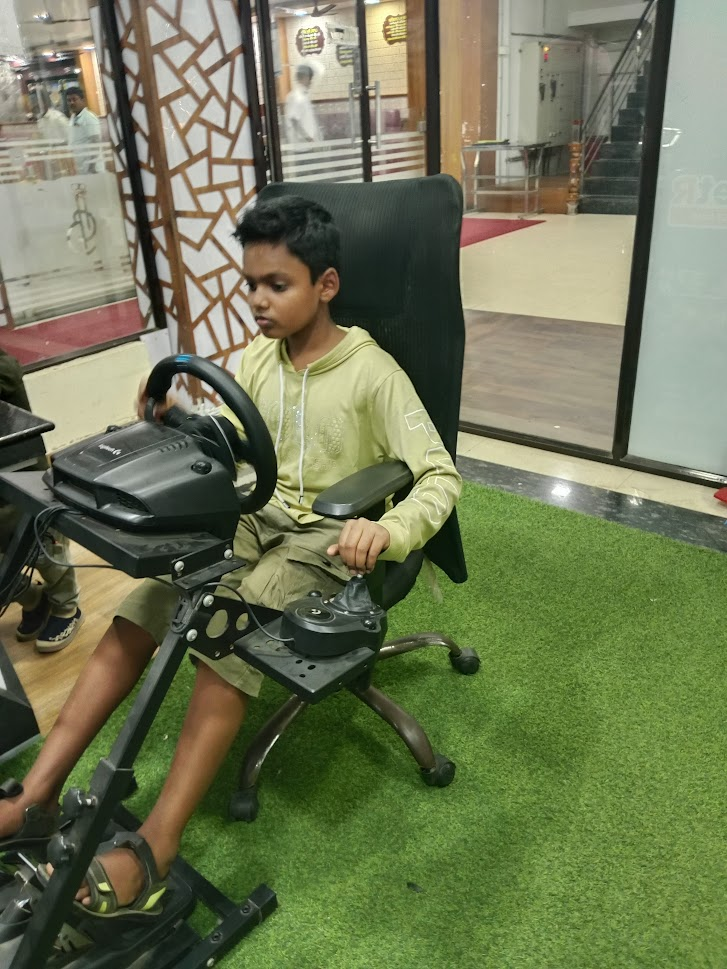 My son chose a car racing simulator game to play first. After paying the fee, they let him play and explained how to play the game. They also explained how to operate the steering wheel, accelerator gear, etc. It had all the equipment that a real car should have, and it was very advanced. My son sat in it and started playing the game. As soon as he started playing the game, he drove the car fast and smoothly. This was easy for him because he already played games on his computer at home, but the accelerator was a little difficult to press as his legs were too small.