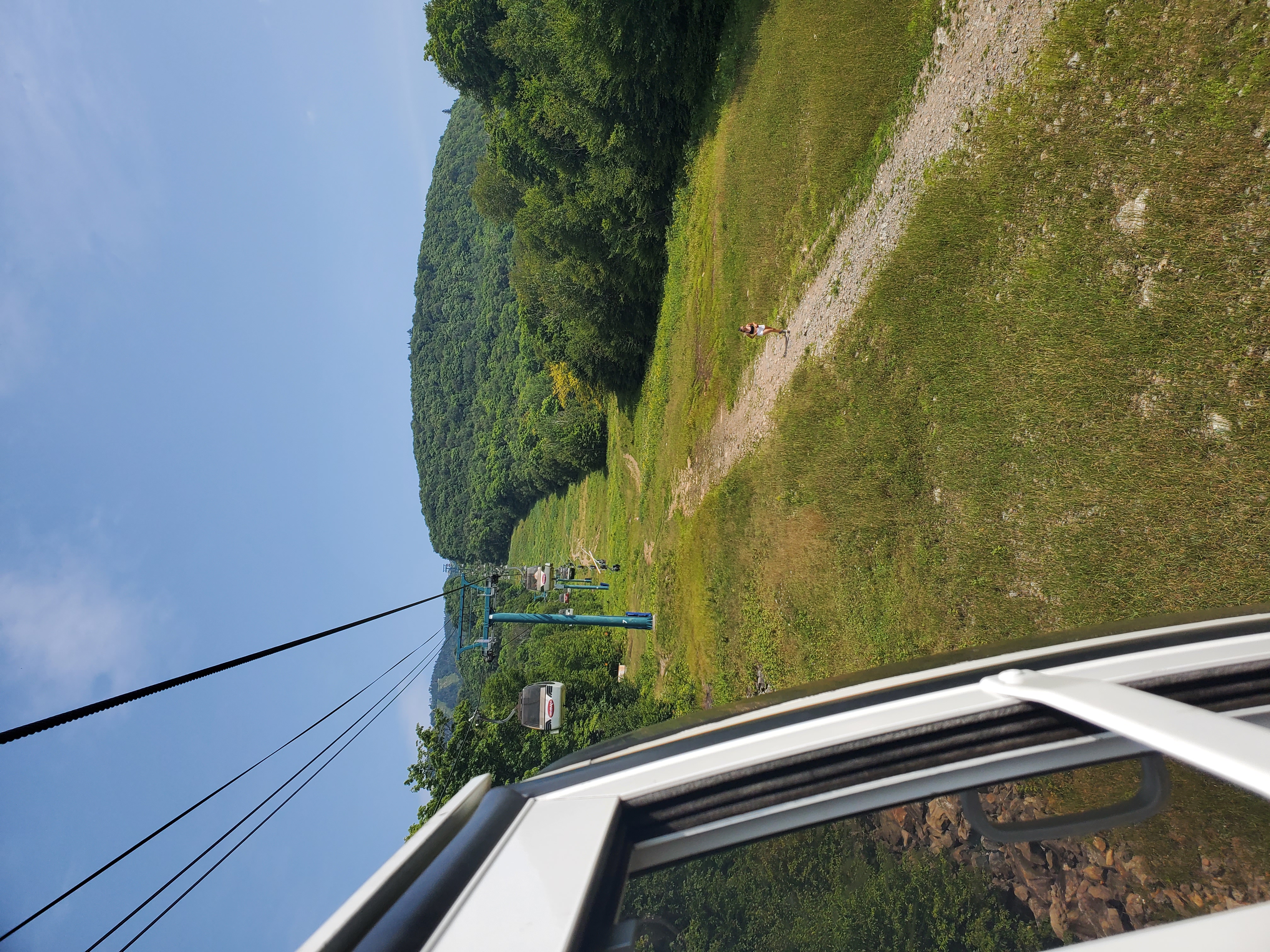 The line climbs above green ski runs while the valleys begin to open up below.