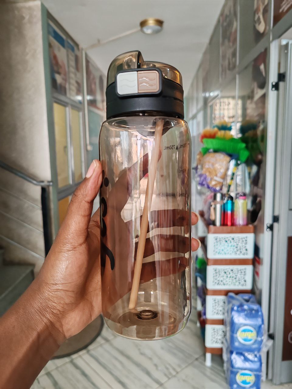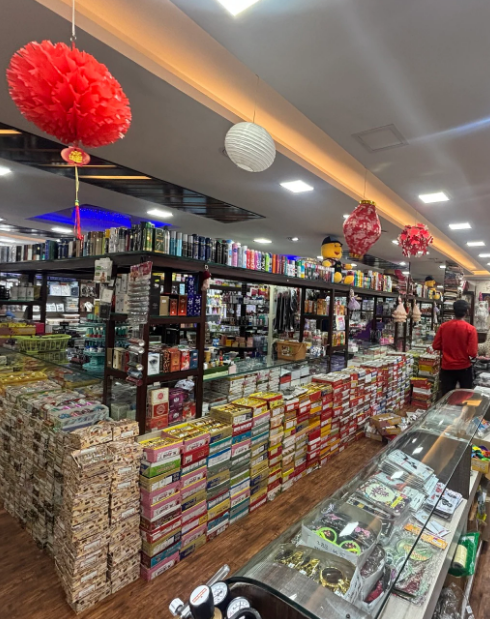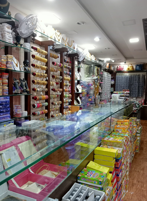In this store, which has three floors, the products are arranged section-wise. Groceries are kept in one section, fancy goods in another, and household items in yet another. In the fancy goods section, a wide variety of earrings, bangles, necklaces, hair accessories, nail polish, lipstick, and home decor items were available.