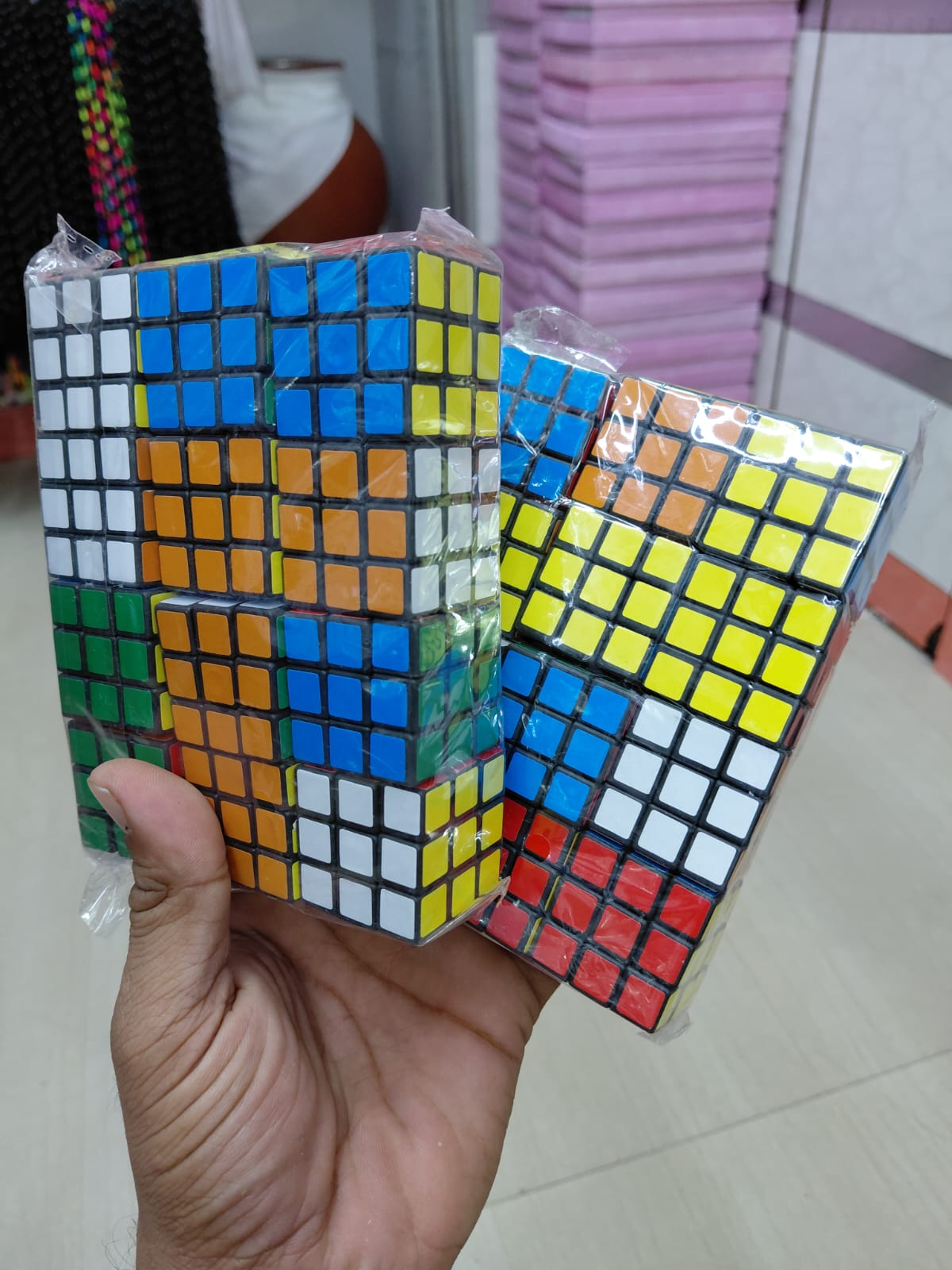 Furthermore, in the section containing toys and children's products, there were many different kinds of toys, including Rubik's cubes, chess sets, carrom boards, various types of chess boards and their accessories, balls, setting-up games, dolls for girls, and for boys, cars, remote-controlled cars, helicopters, airplanes, robots, teddy bears, guns, spinning tops, and yo-yos.