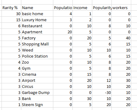 income: 10, popularity: 10, workers: 20