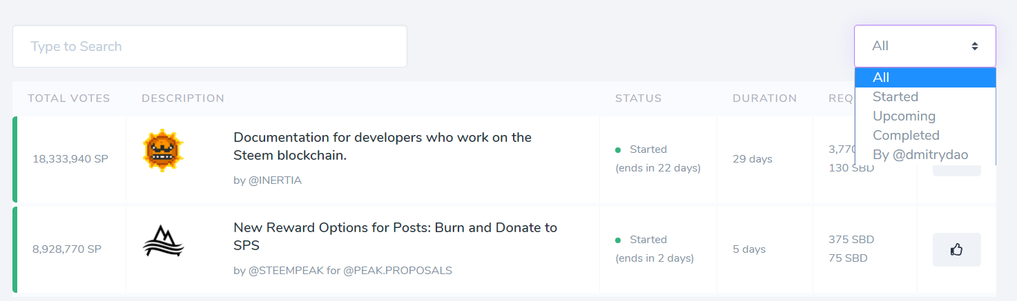 Added filtering by All, Started, Upcoming, Completed and by @dmitrydao (me, lol).