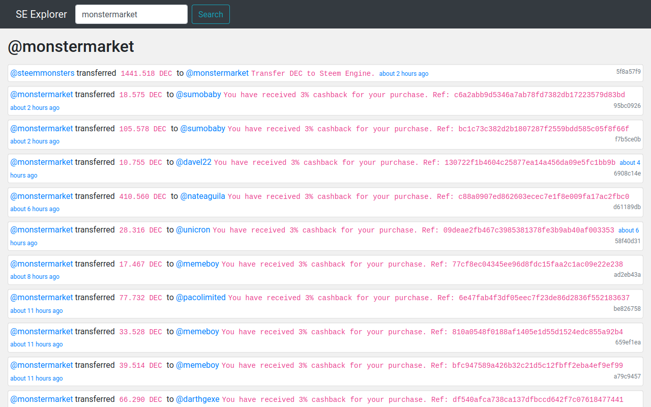 You may know that I run monstermarket.io which sends 3% for cards, and 2% cashback for packs purchase in STEEM/SBD/DEC. I need to check if everything is working properly. So, spend most of my Steem time on block explorers such as steemblockexplorer.com (Steem) and steem-engine.rocks (Steem-engine).