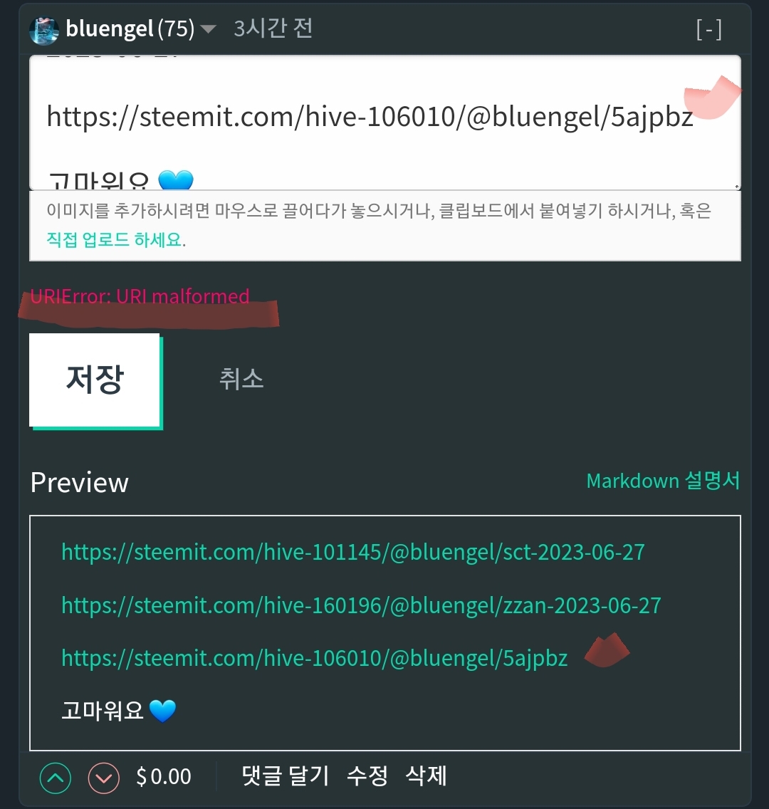 막줄 추가 수정 하려니 빨간 형광펜 표시 부분 처럼 오류 발생