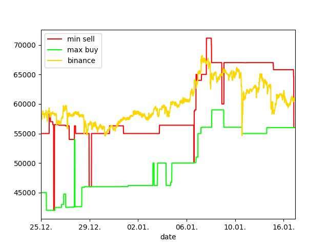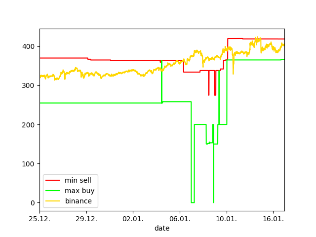 Keep in mind that when collecting the rates, dust orders are not taken into account (less than 0.0001 BTC or 0.001 LTC). The red line shows the lowest sell order (at this price, you can immediately buy) and the greenline indicates the highest buy order (meaning exactly the opposite). Then the yellow line shows us the price on Binance exchange where the price should be the most precise. LTCP price in STEEM is calculated by combining LTC/BTC and STEEM/BTC rates.
