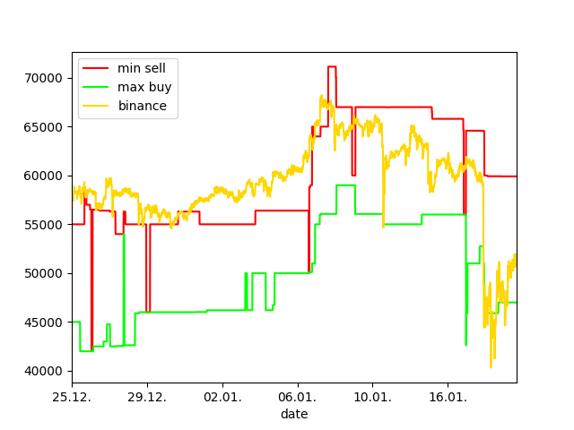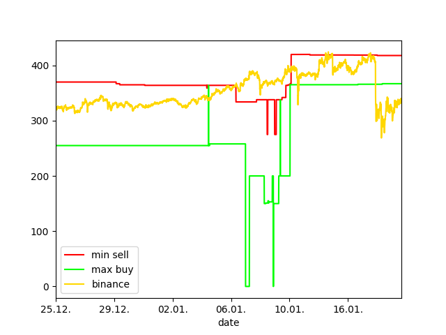 Keep in mind that when collecting the rates, dust orders are not taken into account (less than 0.0001 BTC or 0.001 LTC). The red line shows the lowest sell order (at this price, you can immediately buy) and the greenline indicates the highest buy order (meaning exactly the opposite). Then the yellow line shows us the price on Binance exchange where the price should be the most precise. LTCP price in STEEM is calculated by combining LTC/BTC and STEEM/BTC rates.