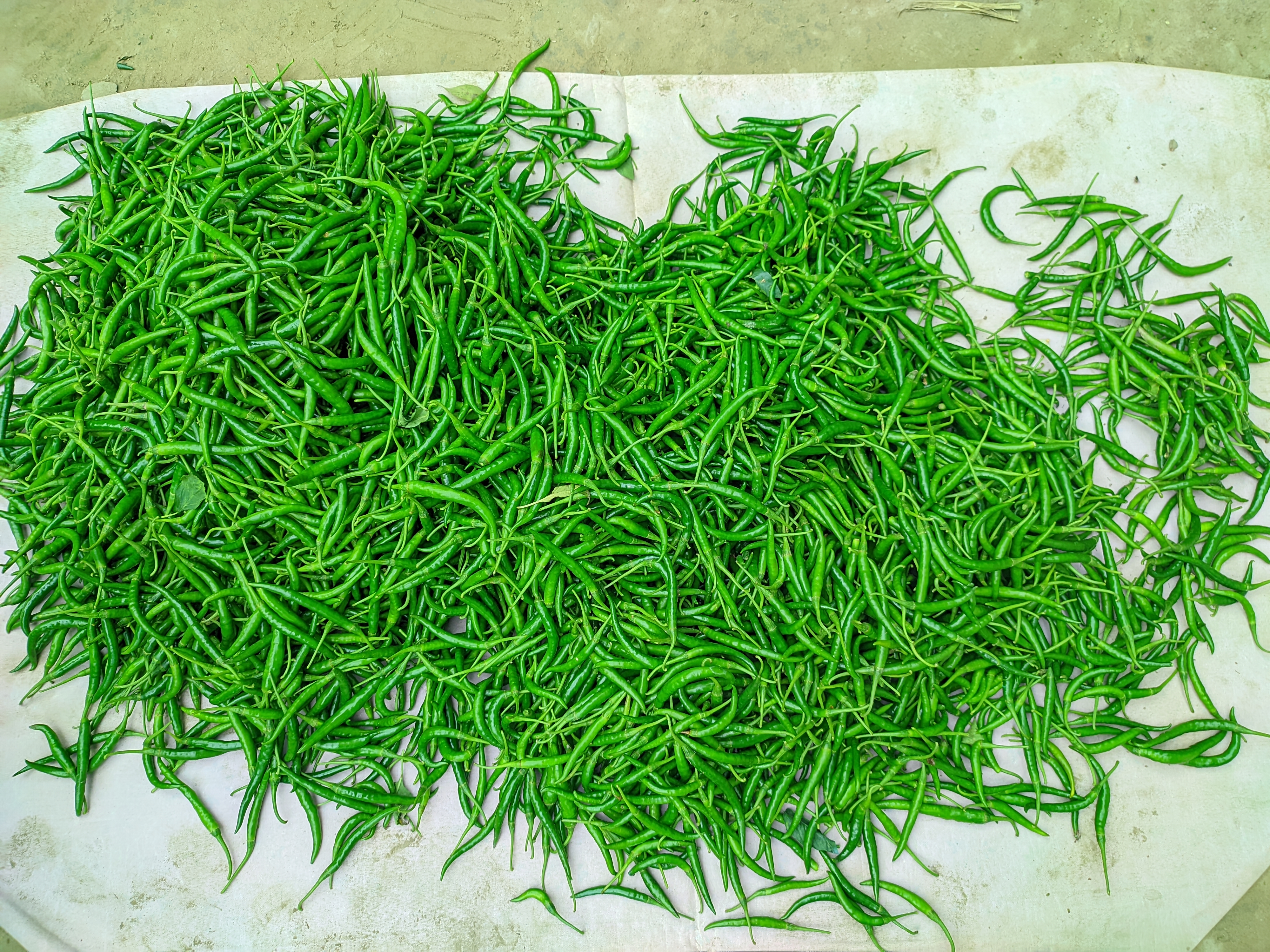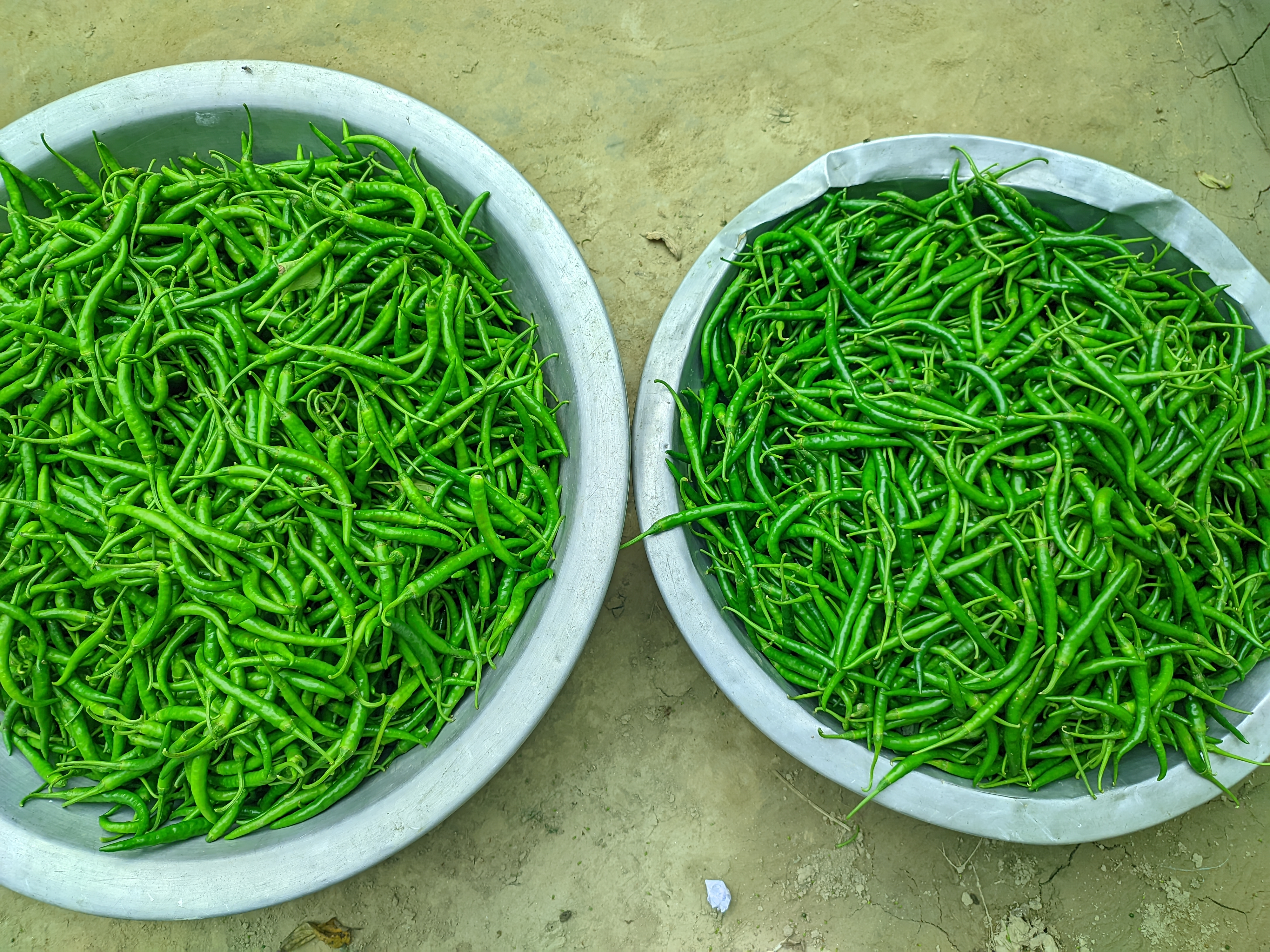 গতকাল সকালে আমাদের জমি থেকে প্রায় এক বস্তা সতেজ মরিচ তোলা হয়েছিল বাজারে বিক্রি করার জন্য। আমার শ্রদ্ধেয় মা খুব যত্ন সহকারে এই সমস্ত মরিচগুলো তুলেছেন। মরিচ তোলার পর আমি নিজেই মাঠ থেকে মরিচগুলো আমাদের বাড়িতে নিয়ে আসি। এরপর, বাড়ির উঠোনে সমস্ত মরিচগুলো একটি পরিষ্কার জায়গায় অনেকটা স্তূপ করে রাখি।